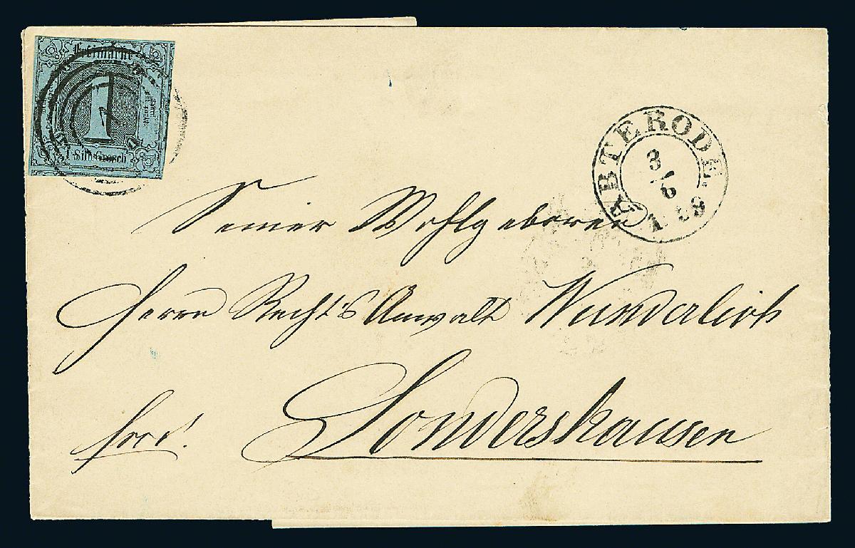 | Zusatzinformationen und Suchstichworte: | Dr. Derichs 177. Auktion 21. - 22. Juni 2024 Los 532 Altdeutschland Thurn und Taxis 1 Sgr. schw./hellgrautürkis, voll- bis überrandiges Luxusstück, unten und rechts mit großen Teilen der Nachbarmarken, auf Brief (rückseitige Klappen teils getrennt) mit Nummernstempel "1" und Aufgabe-K2 "Abterode 3/6 1859" nach Sondershausen/Königreich Preußen. Ein attraktiver Brief mit dem ersten Nummernstempel des Sammelgebietes. Ausruf 100,00 EUR |
