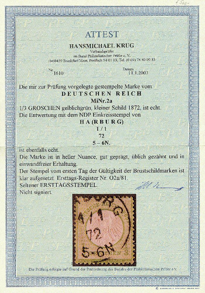| Zusatzinformationen und Suchstichworte: | Dr. Derichs 177. Auktion 21. - 22. Juni 2024 Los 700 Deutsches Reich, 1872 Kleiner Brustschild \ERSTTAGSSTEMPEL\: 1/3 Gr. grün, Kabinettstück mit K1 "Harburg 1/1 72", dem ersten Gültigkeitstag der Brustschilde. Fotoattest Krug BPP: "in einwandfreier Erhaltung" Ausruf 150,00 EUR |