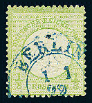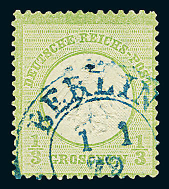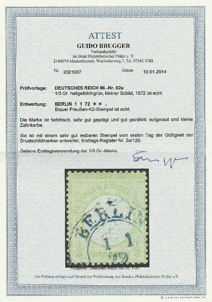 | Zusatzinformationen und Suchstichworte: | Dr. Derichs 177. Auktion 21. - 22. Juni 2024 Los 702 Deutsches Reich, 1872 Kleiner Brustschild \ERSTTAGSSTEMPEL\: 1/3 Gr. grün, farbfrisch, sehr gut geprägt und gut gezähnt, etwas aufgerauht und kleine Zahnkerbe, schön kontrastierend gestempelt mit blauem Preußen-K2 "Berlin 1.1.72", dem Ersttag der Brustschild-Marken. Fotoattest Brugger BPP: "Seltene Ersttagsverwendung der 1/3 Gr.-Marke." Ausruf 100,00 EUR |