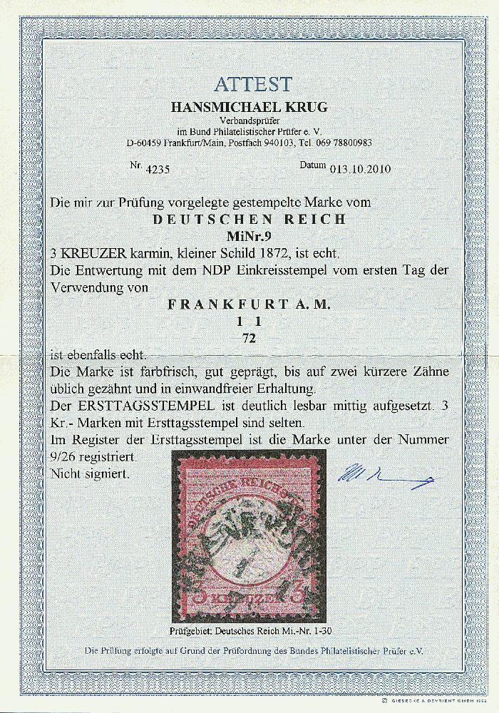 | Zusatzinformationen und Suchstichworte: | Dr. Derichs 177. Auktion 21. - 22. Juni 2024 Los 706 Deutsches Reich, 1872 Kleiner Brustschild \ERSTTAGSSTEMPEL\: 3 Kr. karmin, bis auf zwei kürzere Zähne einwandfrei, mit Ersttagsstempel "Frankfurt a.M. 1.1.72". Fotoattest Krug BPP: "3 Kr.-Marken mit Ersttagsstempel sind selten. Im Register der Ersttagsstempel ist die Marke unter der Nummer 9/26 registriert." Ausruf 100,00 EUR |