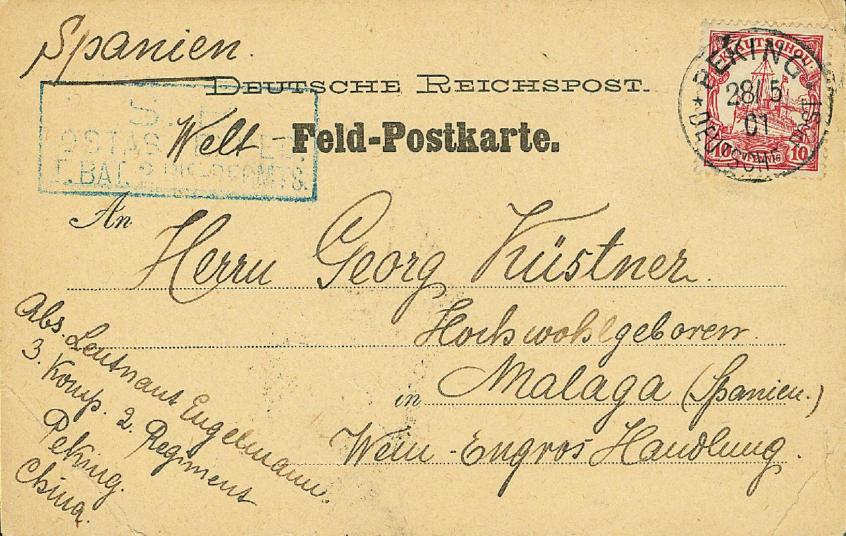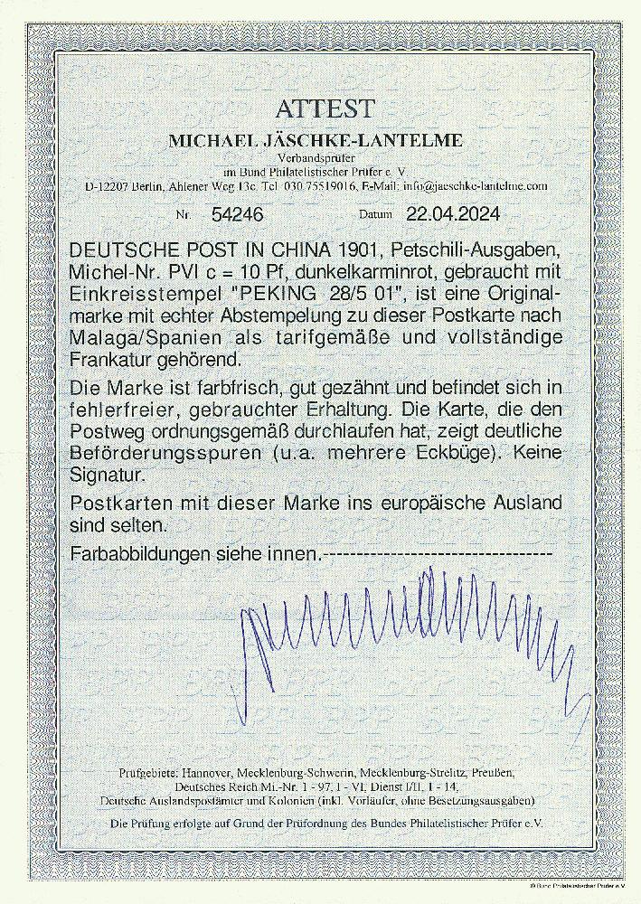 | Zusatzinformationen und Suchstichworte: | Dr. Derichs 177. Auktion 21. - 22. Juni 2024 Los 1502 Deutsche Auslandspost China, Petschili Ausgaben 10 Pfg. "Petschili-Kiautschou", Luxusstück als tarifgerechte Einzelfrankatur auf Feldpostkarte mit Stempel "Peking Deutsche Post 28/5 01" nach Malaga/Spanien, nebengesetzt blauer Soldatenbriefstempel. Bedarfspost dieser Ausgaben ist äußerst selten, insbesondere mit der Destination "Spanien". Ausruf 350,00 EUR |