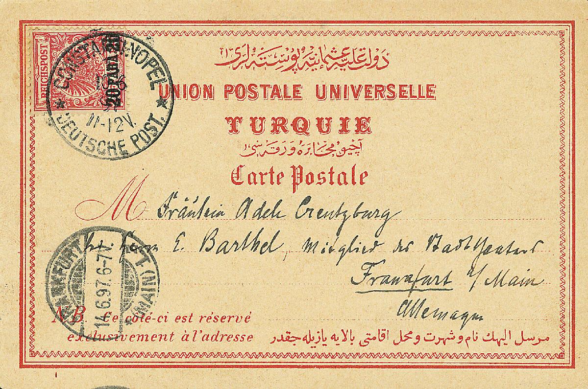 | Zusatzinformationen und Suchstichworte: | Dr. Derichs 177. Auktion 21. - 22. Juni 2024 Los 1542 Deutsche Auslandspost Türkei 20 Para auf 10 Pfg. mittelkarminrot, gute Farbe, Einzelfrankatur auf Ansichtskarte mit Stempel "Constantinopel 1 Deutsche Post, 10.6.97" nach Frankfurt/Main (Ankunftstempel 14.6.97). Luxus. Diese lose gestempelt schon gute Marke ist auf Ganzstück sehr selten. Ausruf 450,00 EUR |