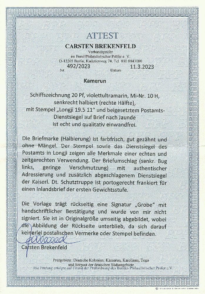 | Zusatzinformationen und Suchstichworte: | Dr. Derichs 177. Auktion 21. - 22. Juni 2024 Los 1589 Deutsche Kolonien Kamerun \SENKRECHTE HALBIERUNG AUF BRIEF\: 20 Pfg. "Kaiseryacht", senkrechte Halbierung (rechte Hälfte) auf kleinem Luxusbrief mit idealem Stempel "Longji Kamerun 19.5.11" und beigesetztem Negativ-Dienstsiegel nach Jaunde. Links unten mit zusätzlich abgeschlagenem Dienstsiegel der Kaiserlich Deutschen Schutztruppe, wie er auf einem Brief mit dieser Halbierung sehr selten ist. Eine große Kamerun- und Afrika-Seltenheit. Ausruf 2.200,00 EUR |
