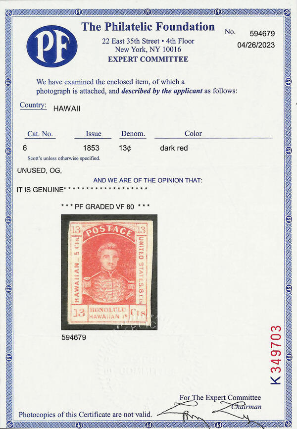 | Zusatzinformationen und Suchstichworte: | Kelleher 799. Auktion 3. - 5. Juni 2024 Los 1295 Hawaii 1853, König Kamehameha III, 13¢ dunkelrot auf dickem weißem gegittertem Papier (Scott 6), Originalgummi, kleiner Falz, Post Office frisch mit intensiver Farbe und attraktiv detail, gerandet volles zu große, Pracht, P. S. E. Eingekapselt, mit 2023 P. F. Attest eingestuft Pracht 80. SMQ Pracht 80; $850. Scott $900. Ausruf 375,00 USD |