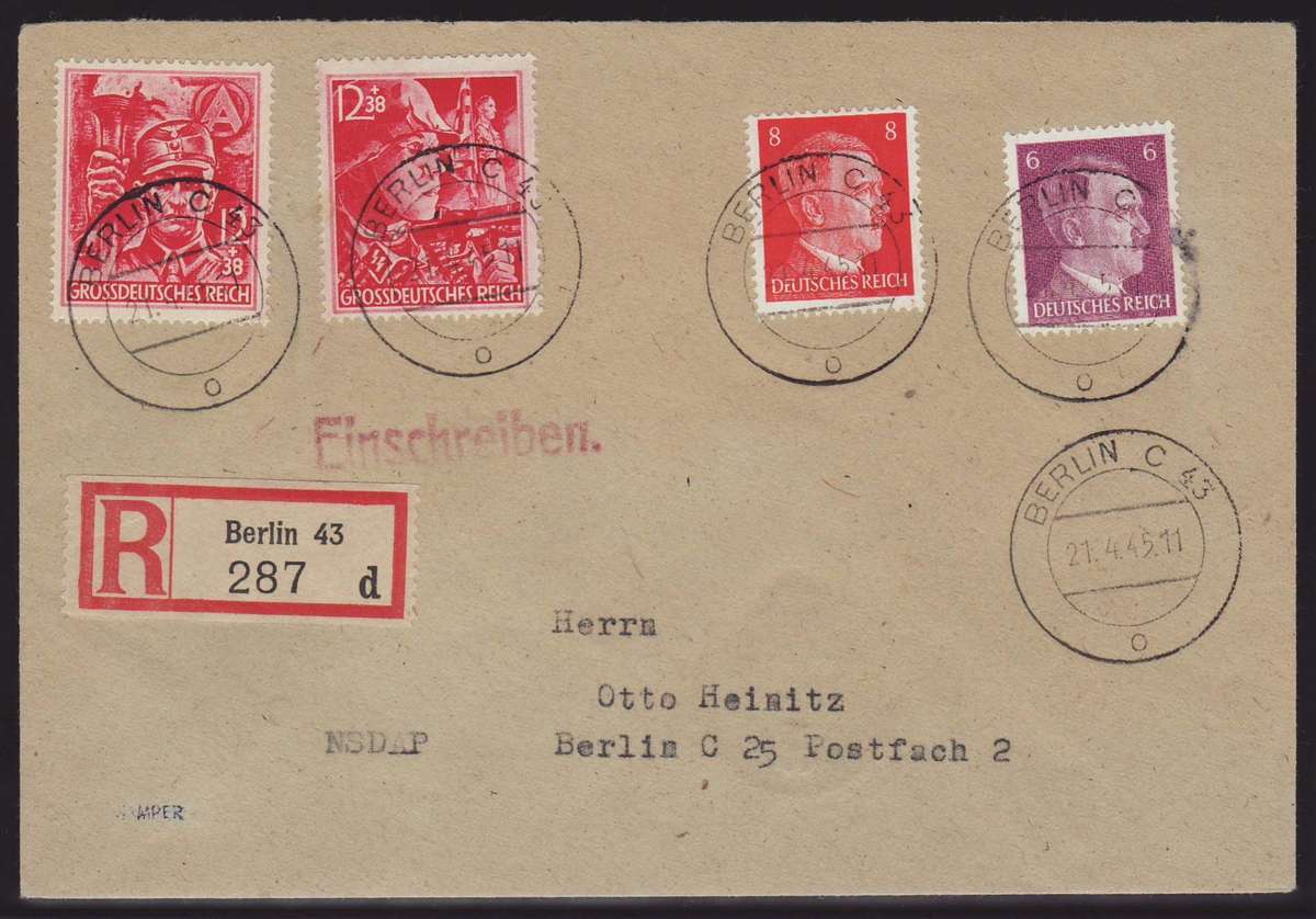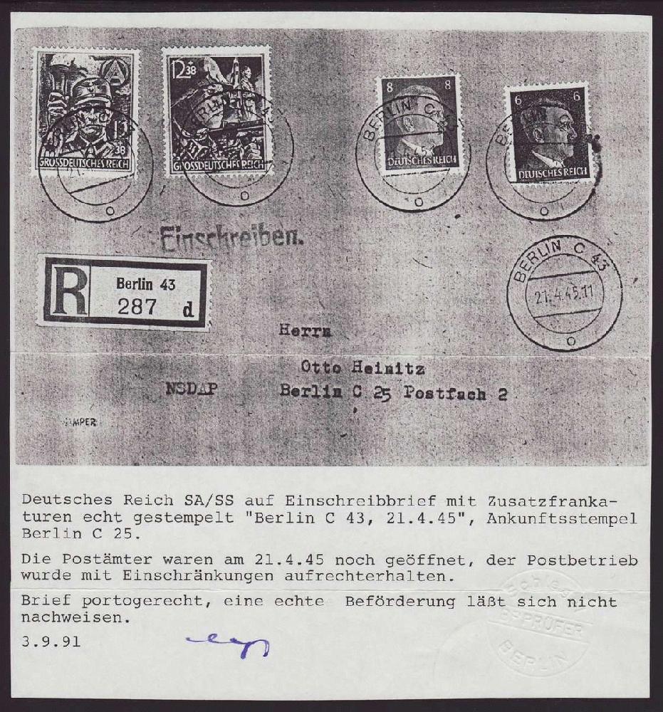 | Zusatzinformationen und Suchstichworte: | Christian E. Geigle Briefmarkenfachhandel Los 0003233955 Deutsches Reich, 1933/45 Drittes Reich 1945, SA/SS, 2 W. kpl. mit Zusatzfrankatur Mi.-Nr. 785 und 786 auf portogerechtem Orts-R-Brief "BERLIN C 43 o 21.4.45 - 11" mit AK-Stempel "BERLIN C 25 d 21.4.45 - 13-14" in tadelloser Kabinetterhaltung, seltener Beleg und die einzige Möglichkeit, die beiden letzten Marken des Deutschen Reiches gestempelt zu dokumentieren, aus dem ausführlichen FB H.-G. Schlegel vom 3.9.1991: "Echt gestempelt. Die Postämter waren am 21.4.45 noch geöffnet, der Postbetrieb wurde mit Einschränkungen aufrechterhalten. Brief portogerecht, eine echte Beförderung läßt sich nicht nachweisen." Nach heutigen Erkenntnissen handelt es sich bei diesen Briefen um zeitgenössische Rückdatierungen aus der unmittelbaren Nachkriegszeit Festpreis 690,00 EUR |