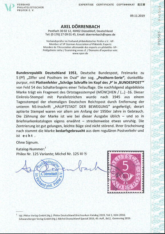 | Zusatzinformationen und Suchstichworte: | ebay.de BRD: Mi.Nr. 125 III, gestempelt, mit Attest Dörrenbach, VP, Mi 400,- (446) Ausruf 80,00 EUR |