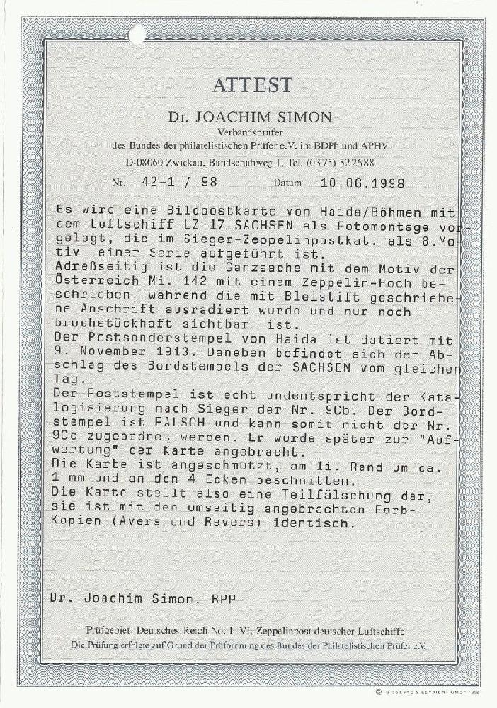 | Zusatzinformationen und Suchstichworte: | philaseiten.de Die Karte stellt eine Teilfälschung dar. Siehe letzter Absatz im Attest |