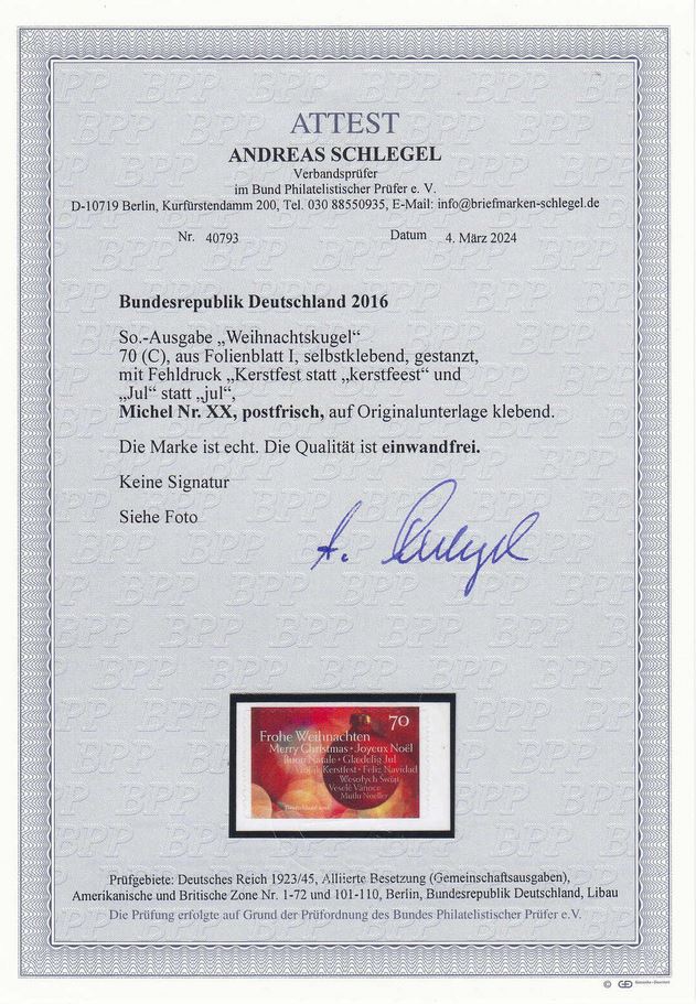 | Prüfer: | Schlegel, Andreas (BPP (Bund Philatelistischer Prüfer)) |