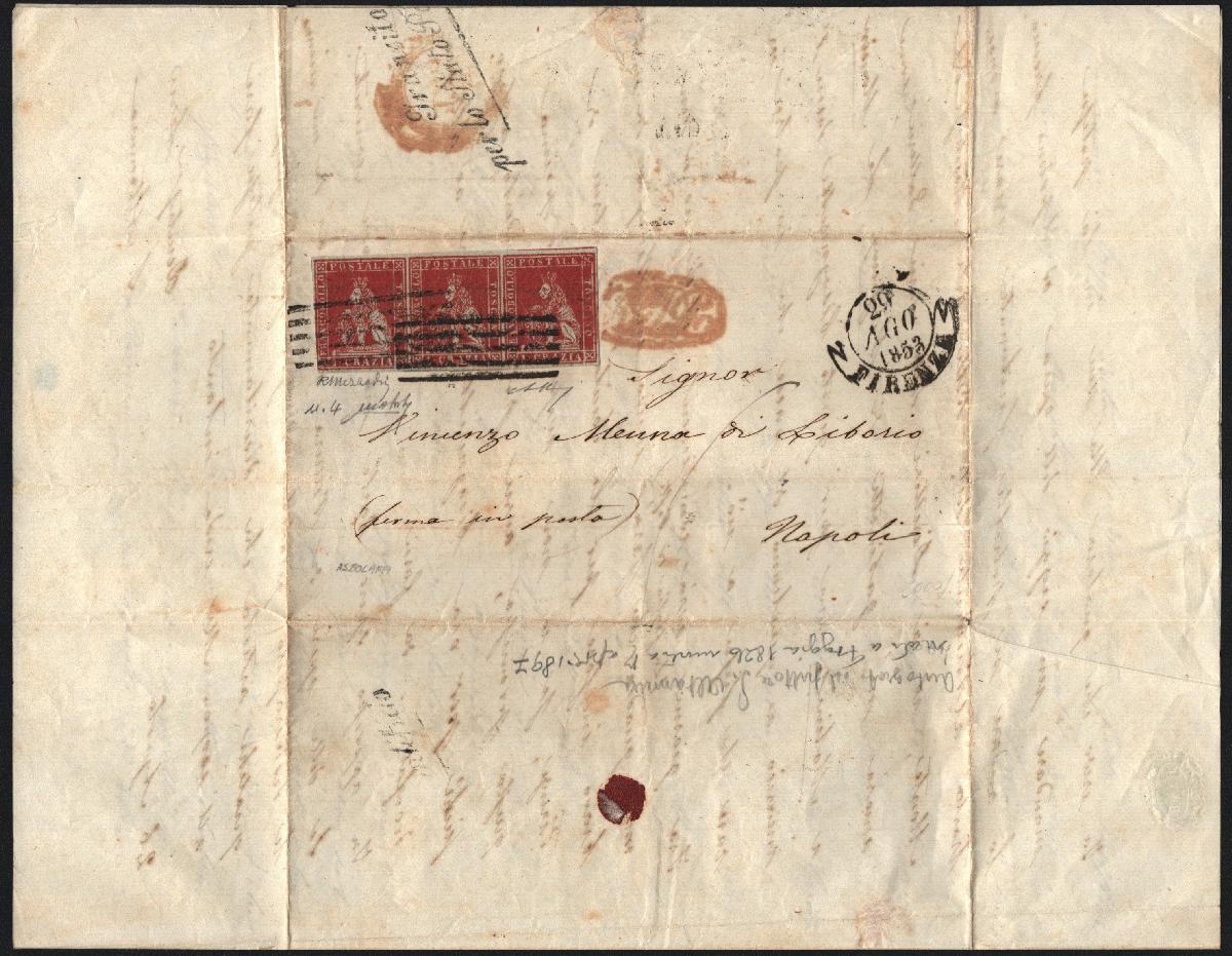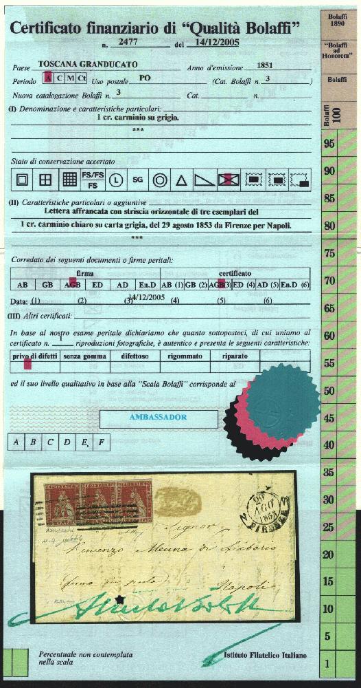 | Zusatzinformationen und Suchstichworte: | Versuch einer Übersetzung: Finanzielles Zertifikat „Bolaffi-Qualität“ N. 2477 vom 14.12.2005 Land TOSKANA GRANDUCATO Ausgabejahr 1851 1 Cr. Karminrot auf Grau. Brief gestempelt mit horizontalem Streifen von drei Kopien von 1 Cr. hellkarminrot auf grauem Papier, datiert 29. August 1853 von Florenz nach Neapel. Aufgrund unserer sachverständigen Prüfung erklären wir, dass die uns vorgelegte Unterlage, die wir der Bescheinigung Nr. 1 fotografische Reproduktionen, authentisch ist und folgende Eigenschaften aufweist: fehlerfrei und sein Qualitätsniveau nach der „Bolaffi-Skala“ entspricht dem AMBASSADOR |