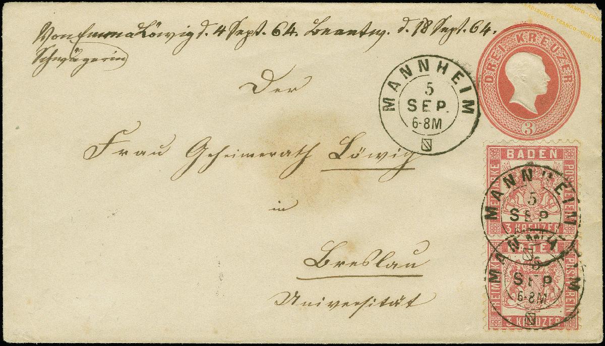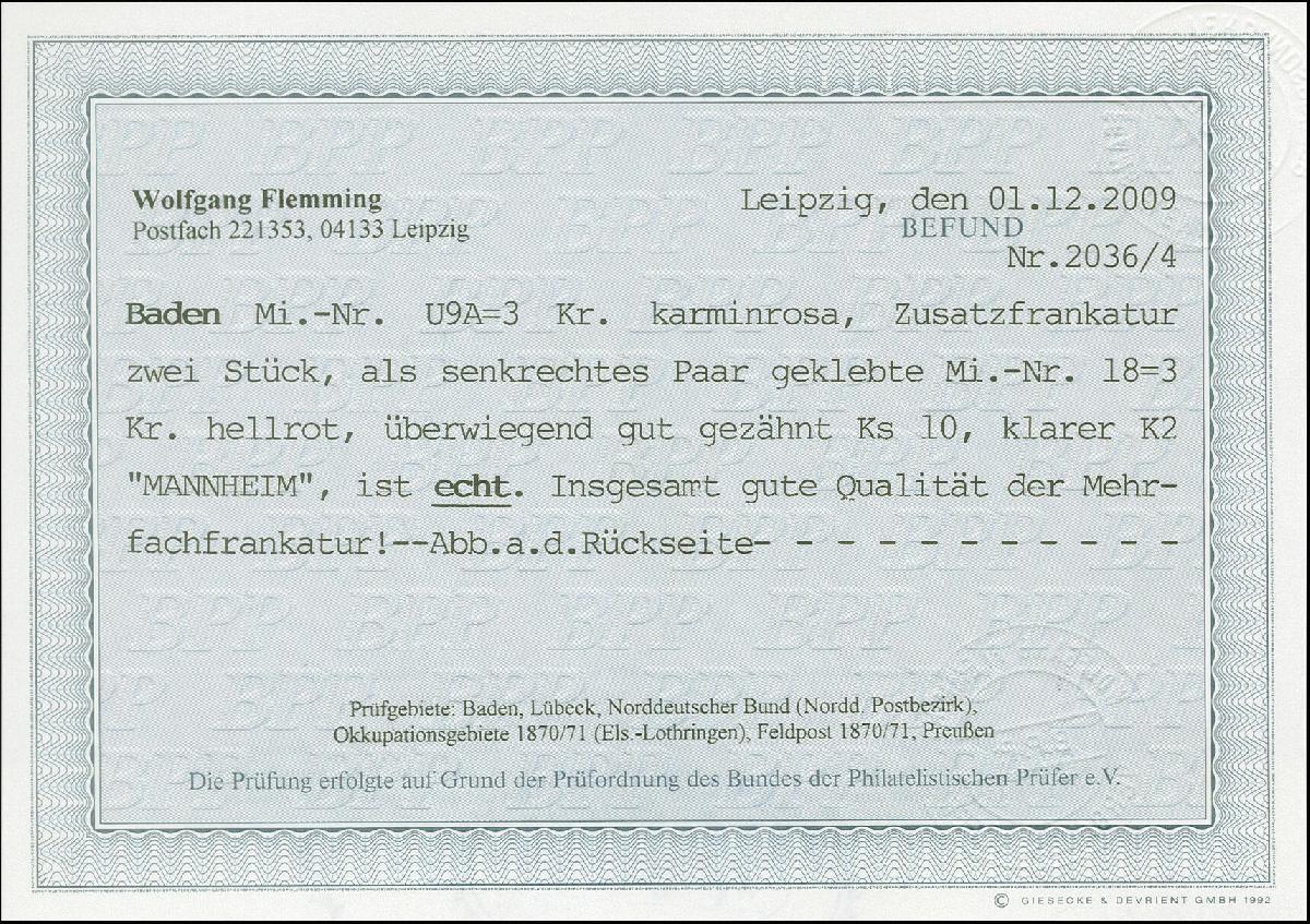 | Zusatzinformationen und Suchstichworte: | Heinrich Köhler 384. Auktion 19./20., 23. - 28. September 2024 Los 3944 Altdeutschland Baden 3 Kr. rosa, 2 Einzelstücke mit sauber auf- und nebengesetztem DKr. "MANNHEIM 5 SEP." als Zufrankatur auf Ganzsachenumschlag 1862, 3 Kr. rosa, nach Breslau. Einwandfrei und sehr attraktiv. Fotobefund Flemming BPP (2009) Ausruf 100,00 EUR |