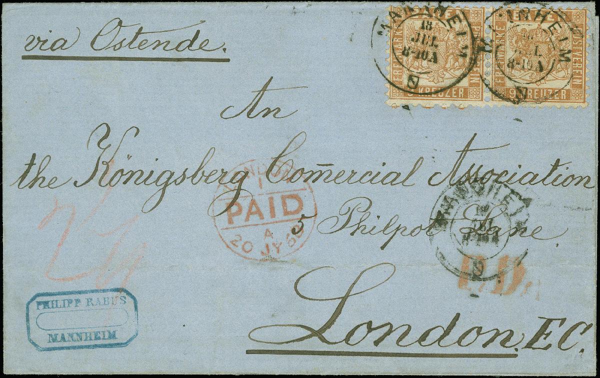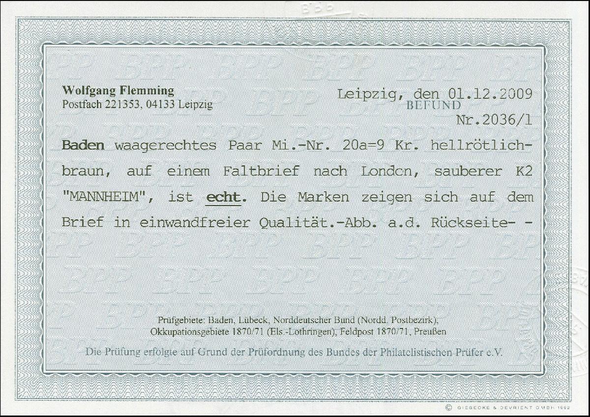 | Zusatzinformationen und Suchstichworte: | Heinrich Köhler 384. Auktion 19./20., 23. - 28. September 2024 Los 3946 Altdeutschland Baden 9 Kr. rötlichbraun im waagerechten Paar, mit DKr. "MANNHEIM 18 JUL."(1869) auf Briefhülle über Belgien nach London mit vorderseitigem Eingangsstempel. Einwandfrei. Fotobefund Flemming BPP (2009) Ausruf 180,00 EUR |