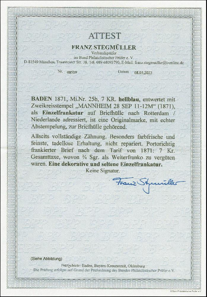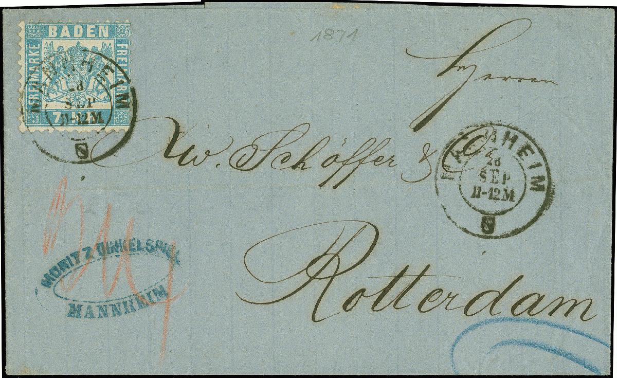 | Zusatzinformationen und Suchstichworte: | Heinrich Köhler 384. Auktion 19./20., 23. - 28. September 2024 Los 3950 Altdeutschland Baden 7 Kr. hellblau, mit auf- und nebengesetztem DKr. "MANNHEIM 28 SEP." (1871) auf Briefhülle nach Rotterdam. Tadellos. Eine sehr attraktive Einzelfrankatur der seltenen Farbe. Ausruf 250,00 EUR |