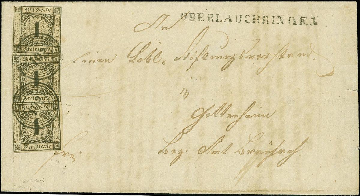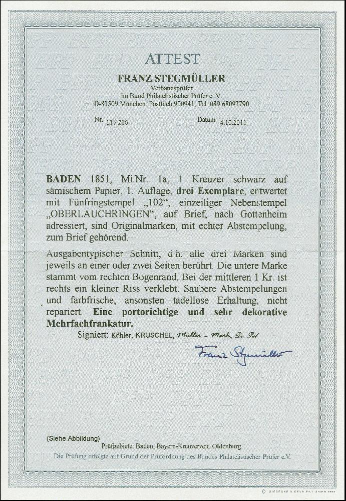 | Zusatzinformationen und Suchstichworte: | Heinrich Köhler 384. Auktion 19./20., 23. - 28. September 2024 Los 6502 Altdeutschland Baden 1 Kreuzer auf sämisch, 3 Einzelwerte als senkrechter Streifen geklebt, ausgabetypisch gut geschnitten, die untere Marke mit schmalem rechten Bogenrand, mit sauber aufgesetzter Nr. "102" und sauber nebengesetztem L1 "OBERLAUCHRINGEN" auf komplettem Faltbrief nach Gottenheim. Die mittlere Marke rechts unten kleiner verklebter Einriss, sonst einwandfrei. Eine sehr seltene und attraktive Mehrfachfrankatur Ausruf 1.200,00 EUR |