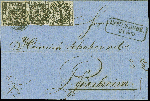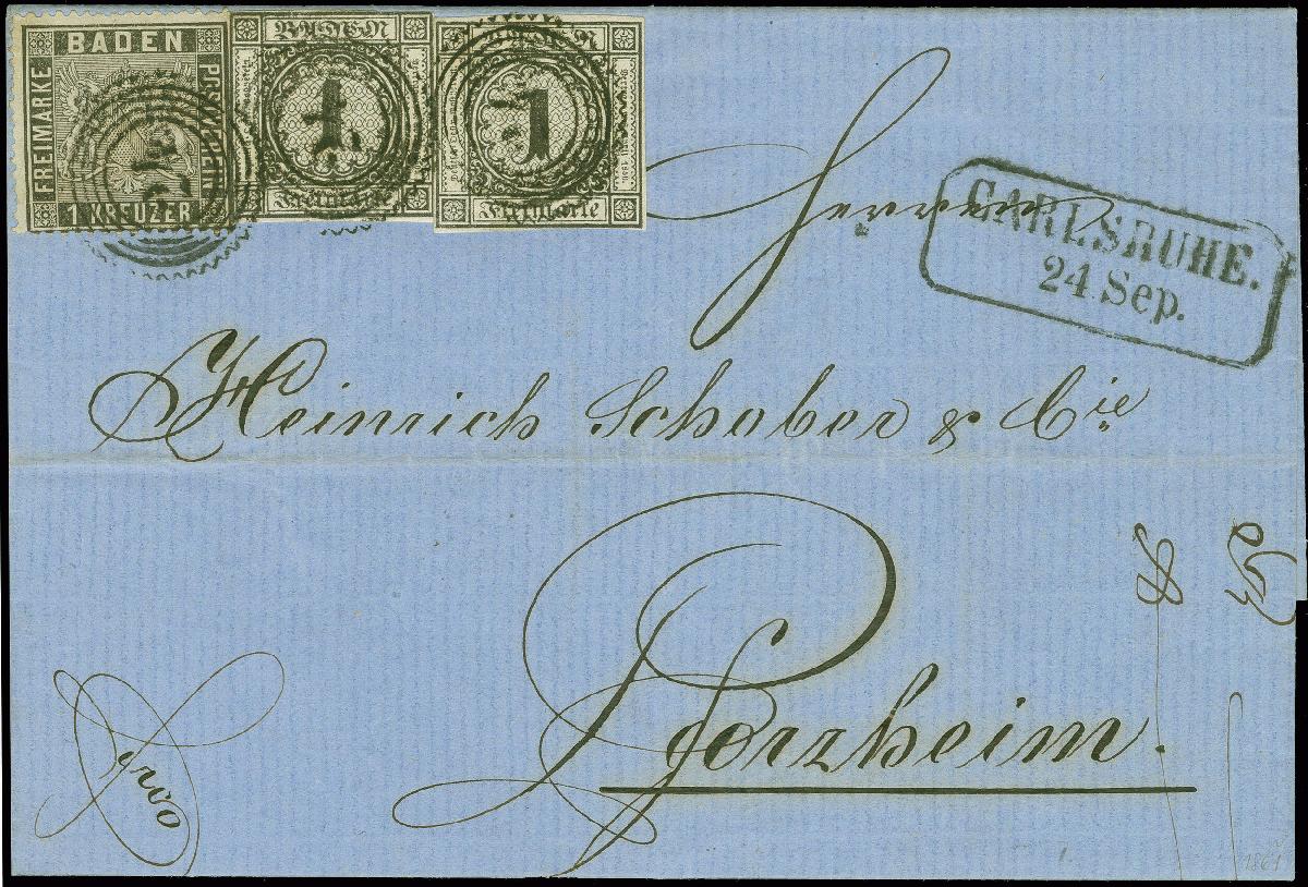 | Zusatzinformationen und Suchstichworte: | Heinrich Köhler 384. Auktion 19./20., 23. - 28. September 2024 Los 6525 Altdeutschland Baden 1 Kreuzer schwarz, 2 Einzelwerte in üblichem Schnitt, einer voll- bis breitrandig, in wertstufengleicher Mischfrankatur mit 1860/61, 1 Kreuzer schwarz, mit Zackenkranz "24" und sauber nebengesetztem Ra2 "CARLSRUHE 24 Sep." (1861) auf komplettem Faltbrief nach Pforzheim. Die gezähnter Marke durch Randklebung in der Zähnung unbedeutend fehlerhaft, der berührte Wert kleiner Randspalt, sonst einwandfreie Erhaltung. Eine außerordentlich seltene wertstufengleich Mischfrankatur, es ist nur eine weitere registriert. Ausruf 2.000,00 EUR |