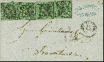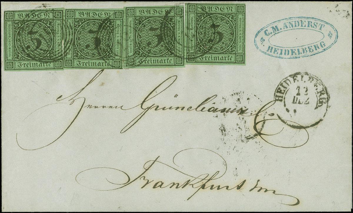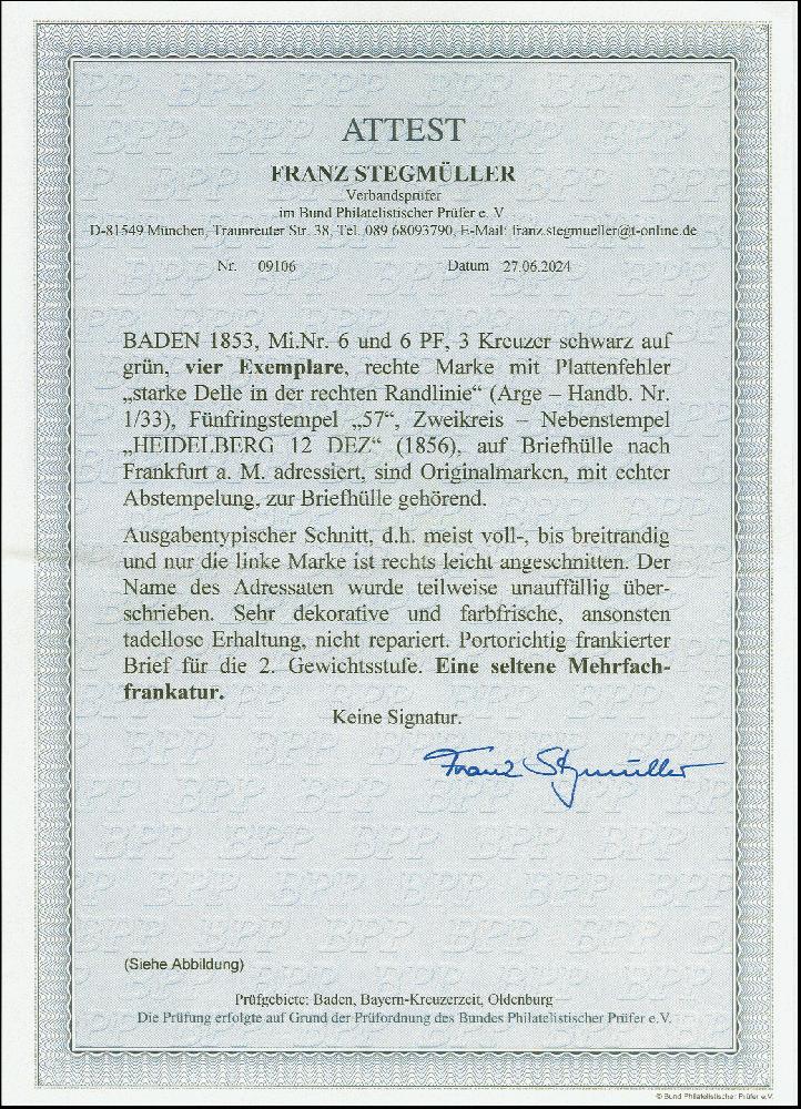 | Zusatzinformationen und Suchstichworte: | Heinrich Köhler 384. Auktion 19./20., 23. - 28. September 2024 Los 6528 Altdeutschland Baden 3 Kreuzer auf grün, 4 Einzelwerte, die linke mittig gering angeschnitten, sonst bis auf 2 minimale Berührungen alle voll- bis breitrandig, mit Nr. "57" und nebengesetztem DKr. "HEIDELBERG 12 DEZ" (1856) auf Briefhülle nach Frankfurt am Main. Schöne und sonst einwandfreie Erhaltung. Eine seltene Mehrfachfrankatur. Ausruf 800,00 EUR |