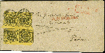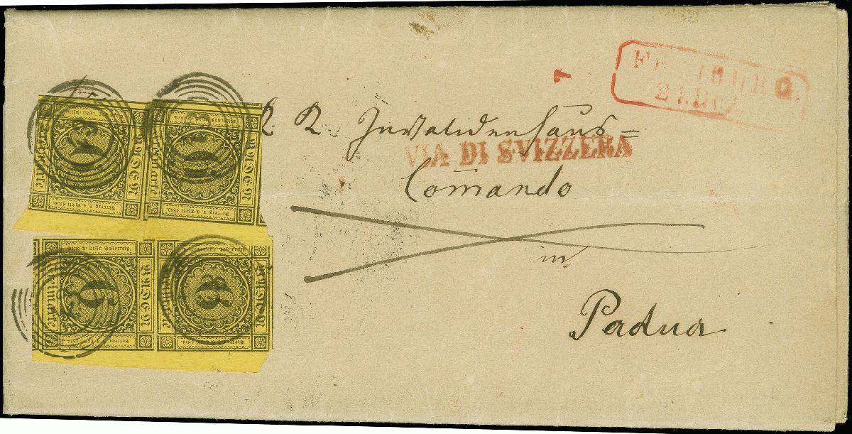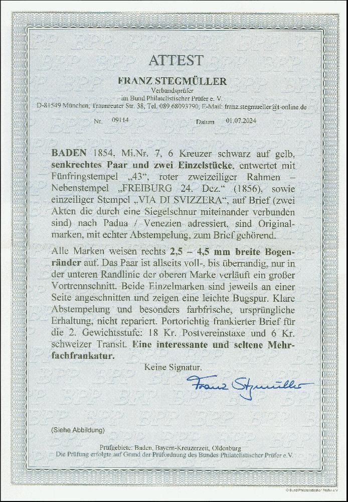 | Zusatzinformationen und Suchstichworte: | Heinrich Köhler 384. Auktion 19./20., 23. - 28. September 2024 Los 6530 Altdeutschland Baden 6 Kreuzer auf gelb, senkrechtes Paar und 2 Einzelstücke, alle mit ca. 2,5/4,5 mm rechtem Bogenrand, das Paar voll- bis überrandig mit großem Vortrennschnitt in der unteren Randlinie der obere Marke verlaufend, die Einzelwerte jeweils leicht berührt und unmerkliche Bugspur, mit Nr. "43" und nebengesetztem roten Ra2 "FREIBURG24.Dez." (1856) auf kompletter Briefsendung der 2.Gewichtsstufe (2 Akten durch Siegelschnur verbunden) über die Schweiz nach Padua. Ursprüngliche und sonst einwandfreie Erhaltung. Eine, insbesondere in dieser Form sehr seltene und attraktive Mehrfachfrankatur Ausruf 1.500,00 EUR |