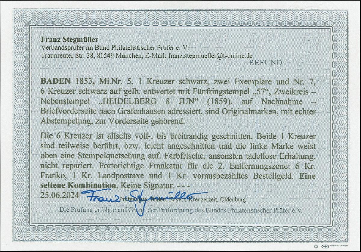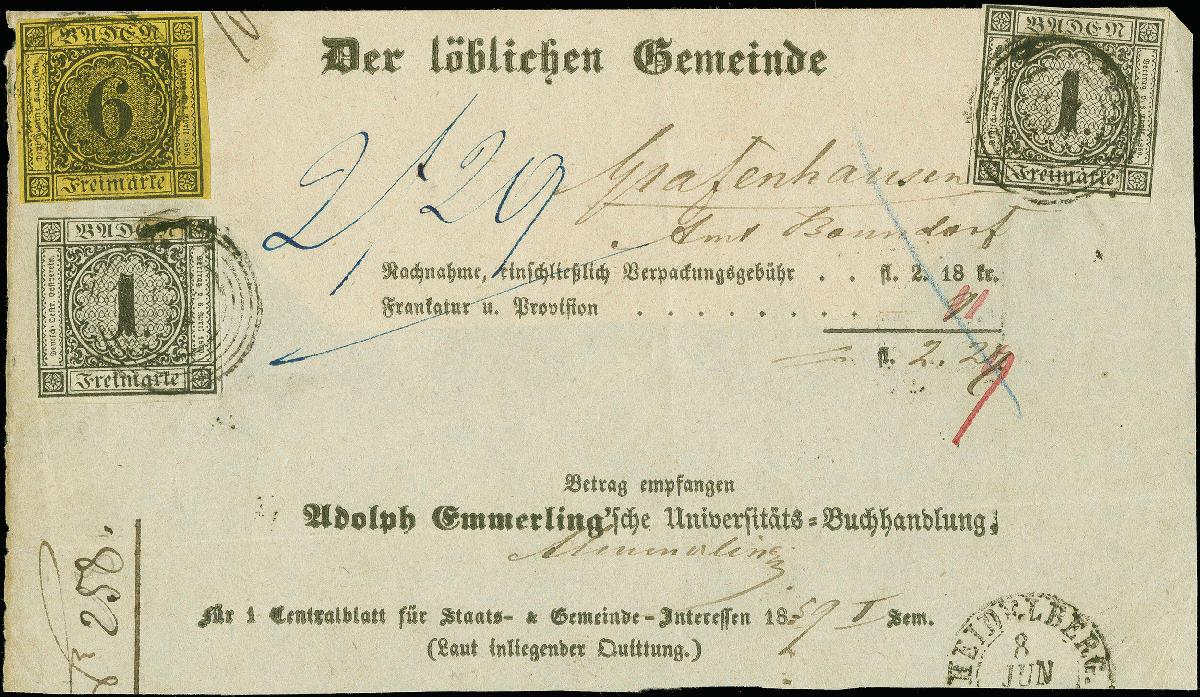 | Zusatzinformationen und Suchstichworte: | Heinrich Köhler 384. Auktion 19./20., 23. - 28. September 2024 Los 6533 Altdeutschland Baden 6 Kreuzer auf gelb, voll- bis breitrandig, mit 2 Einzelwerten 1 Kreuzer schwarz, mit Nr. "57" und nebengesetztem DKr. von Heidelberg auf Nachnahme-Briefvorderseite (mit einem Seitenteil), nach Grafental. Portogerecht der Frankatur mit 1 Kreuzer Landpost Taxe und 1 Kreuzer vorausbezahlten Bestellgeld Ausruf 100,00 EUR |