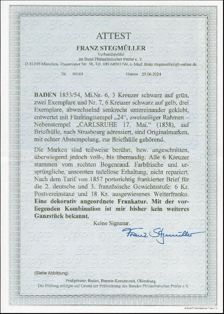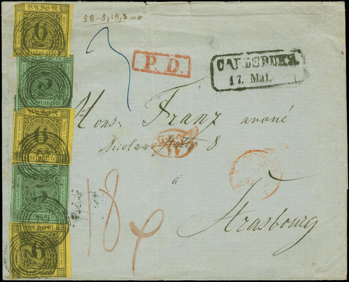 | Zusatzinformationen und Suchstichworte: | Heinrich Köhler 384. Auktion 19./20., 23. - 28. September 2024 Los 6534 Altdeutschland Baden 6 Kreuzer auf gelb, 3 Einzelwerte mit schmalem rechtem Bogenrand, abwechselnd geklebt mit 2 Werten 3 Kreuzer auf grün, mit Nr. "24" und nebengesetztem Ra2 "CARLSRUHE 17. Mai." auf Briefhülle der 2. deutschen und 3. französischen Gewichtsstufe, nach Straßburg, portogerecht frankiert mit 6 Kreuzern Vereinsporto und 18 Kreuzern ausgewiesenem Weiterfranko. Die oben klebende 6 Kreuzer kleiner Eckfehler, die Hülle oben 2 kleine Einrisse und üblich senkrecht gefaltet, sonst einwandfrei. Eine sehr attraktive und einmalige Frankatur. Ausruf 2.000,00 EUR |