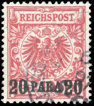 | Zusatzinformationen und Suchstichworte: | DBA Freiburg GmbH Los 1730010281 Deutsche Auslandspost Türkei 1889, 20 PA. auf 10 Pfg. Krone/Adler gestempelt in der Type "ca", aktueller Farbfotobefund Jäschke-L. BPP vom 02.11.2017 "echt und einwandfrei" (ME 400.-) Festpreis 180,00 EUR |