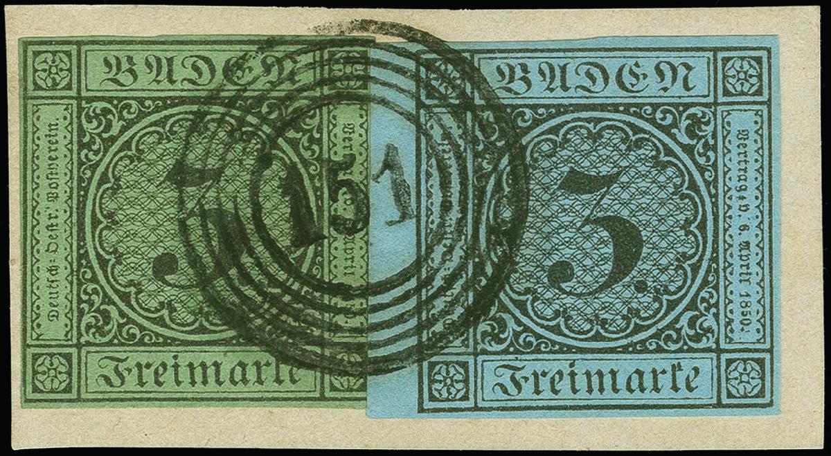 | Zusatzinformationen und Suchstichworte: | Heinrich Köhler 384. Auktion 19./20., 23. - 28. September 2024 Los 6539 Altdeutschland Baden 3 Kreuzer auf grün in wertstufengleicher Mischfrankatur mit 3 Kreuzer auf blau, letztere voll- bis breitrandig mit ca. 3 mm Bogenrand, mit klar aufgesetzter Nr. "151" WAIBSTADT auf Briefstück. Tadellos, die Nr. 8 gelöst und mit Falz befestigt um einen rückseitigen Abklatsch sichtbar zu machen. Eine sehr seltene Kombination. Ausruf 250,00 EUR |