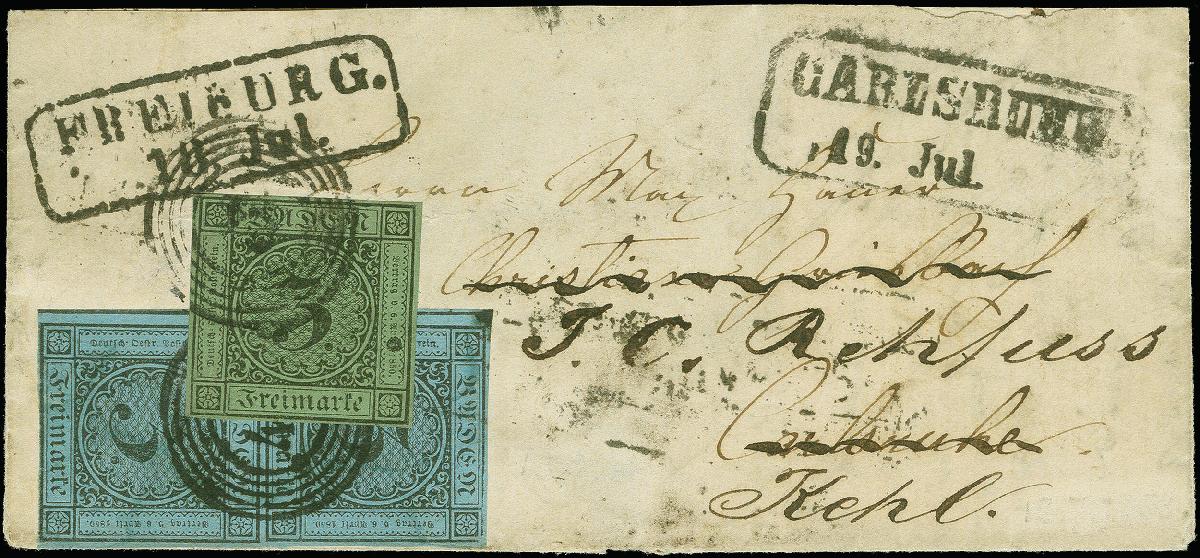 | Zusatzinformationen und Suchstichworte: | Heinrich Köhler 384. Auktion 19./20., 23. - 28. September 2024 Los 6540 Altdeutschland Baden 3 Kreuzer auf blau im senkrechten Paar, unten etwas berührt, sonst voll- bis überrandig, mit Nr. "43" und nebengesetztem Ra2 "FREIBURG 18. Jul." auf kleiner Briefhülle nach Karlsruhe, hier neu frankiert mit 3 Kreuzer auf grün, voll- bis breitrandig, mit Nr. "24" und nebengesetztem Ra2 "CARLSRUHE 19. Jul.", weitergesandt nach Kehl. Eine Seitenklappe fehlt, die anderen teils verkürzt. Die Einzelmarke war zur Kontrolle gelöst und erscheint in der Durchsicht gering hell, sonst einwandfrei und attraktiv. Eine in dieser Form wohl einmalige Frankaturkombination. Ausruf 400,00 EUR |