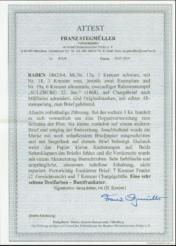 | Zusatzinformationen und Suchstichworte: | Heinrich Köhler 384. Auktion 19./20., 23. - 28. September 2024 Los 6545 Altdeutschland Baden 1862/66, Weißer Grund weit gezähnt: 1 Kreuzer schwarz und 3 Kreuzer rosa, je 2 Einzelwerte, zusammen mit 6 Kreuzer ultramarin, mit sauber aufgesetztem Ra2 "SULZBURG 22 Jan." auf Chargé-Briefhülle (3 Seitenklappen fehlend) nach Mülheim. Die rechts klebende 3 Kreuzer wurde hier, wohl zum Schaden der Post, wiederverwendet, sie ist mit noch anhaftenden Briefpapier mit Siegellack befestigt. Auf der Vorderseite Aktenbeschriftung, sonst einwandfreie Erhaltung. Eine attraktive und in dieser Form sehr seltene Buntfrankatur. Ausruf 1.000,00 EUR |