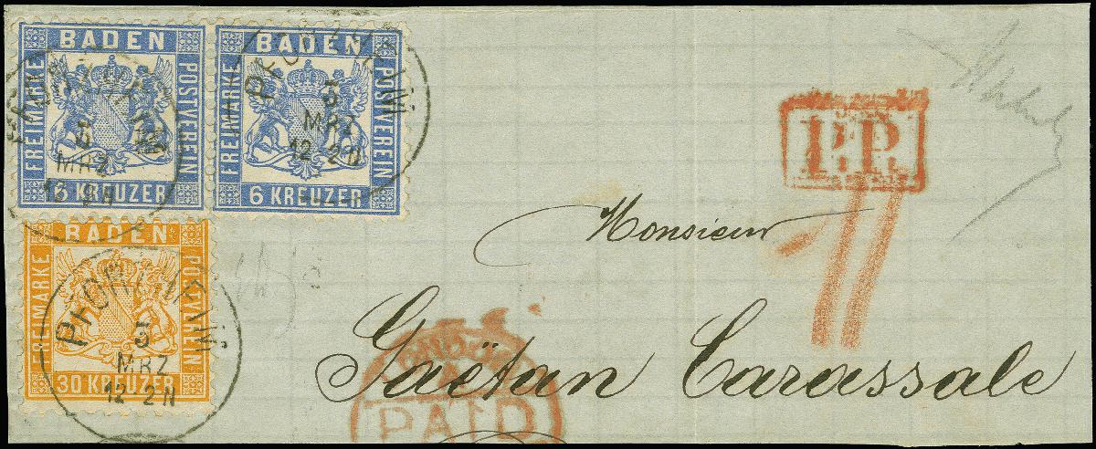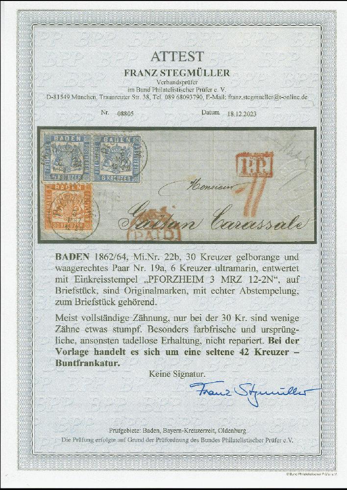 | Zusatzinformationen und Suchstichworte: | Heinrich Köhler 384. Auktion 19./20., 23. - 28. September 2024 Los 6549 Altdeutschland Baden 30 Kreuzer gelborange und waagerechtes Paar 6 Kreuzer ultramarin, alle farbfrisch und bis auf wenige stumpfe Zahnspitzen bei der 30 Kreuzer einwandfrei, mit leicht und sauber aufgesetztem EKr. "PFORZHEIM 3 MRZ" auf größerem Briefstück. Eine attraktive und seltene 42 Kreuzer-Kombination. Ausruf 600,00 EUR |