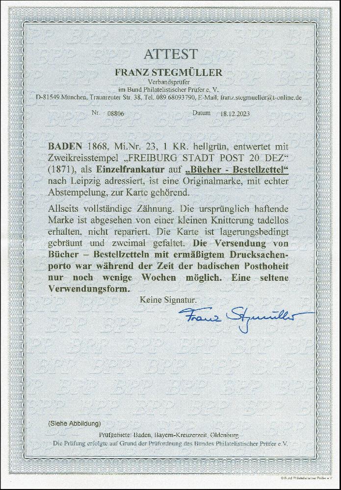 | Zusatzinformationen und Suchstichworte: | Heinrich Köhler 384. Auktion 19./20., 23. - 28. September 2024 Los 6550 Altdeutschland Baden 1868,1 Kreuzer grün, farbfrisch und gut gezähnt, mit DKr. Freiburg Stadt Post 20 DEZ (1871) auf "Bücher-Bestellzettel" nach Leipzig. Die Marke bis auf eine kleine Knitterung tadellos, die Karte lagerungsbedingt gebräunt und zweimal gefaltet. Eine außerordentlich seltene Verwendungsform; Bücher-Bestellzettel zum ermäßigten Drucksachen Porto sind mit Baden-Frankatur nur wenige Wochen möglich, wir haben nur 2 weitere Belege registriert. Ausruf 400,00 EUR |