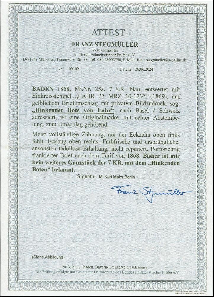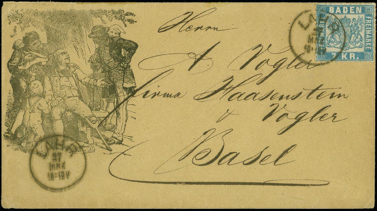 | Zusatzinformationen und Suchstichworte: | Heinrich Köhler 384. Auktion 19./20., 23. - 28. September 2024 Los 6553 Altdeutschland Baden 7 Kreuzer blau, farbfrisch und bis auf einen fehlenden Zahn oben links einwandfrei, mit EKr. "LAHR 27 MRZ."(1869) auf illustriertem Briefkuvert 'Hinkender Boote von Lahr', nach Basel mit Ankunftsstempel. Ein sehr attraktives Stück von großer Seltenheit; mit dieser Frankatur ist bisher kein weiterer Umschlag des 'Hinkenden Boten' bekannt. Ausruf 1.800,00 EUR |