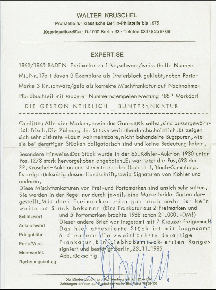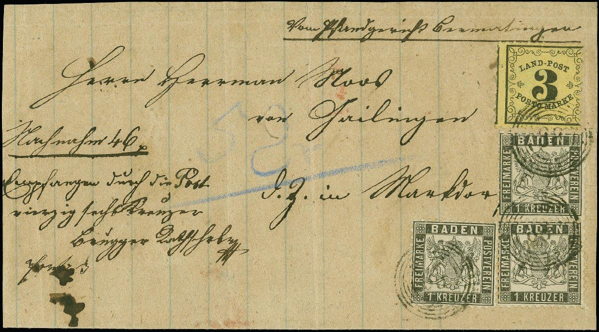 | Zusatzinformationen und Suchstichworte: | Heinrich Köhler 384. Auktion 19./20., 23. - 28. September 2024 Los 6561 Altdeutschland Baden Landpost 1 Kreuzer schwarz, senkrechtes Paar und Einzelmarke, vorschriftswidrig als Portomarken verwendet, in Mischfrankatur mit Landpost-Portomarke 3 Kreuzer auf gelb, mit Nr. "88" MARKDORF auf Briefvorderseite einer Nachnahme-Sendung aus Bermattingen im eigenen Bestellbezirk. Die Portomarke einige kurze Zähne 21 Kreuzer-Werte geringe Bugspur, sonst tadellos. Eine äußerst seltene und attraktive Mischfrankatur Ausruf 4.000,00 EUR |