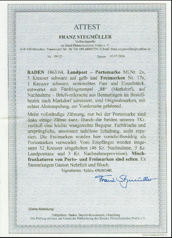 | Prüfgebiet: | Altdeutschland Baden Landpost-Portomarken |