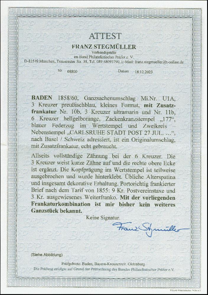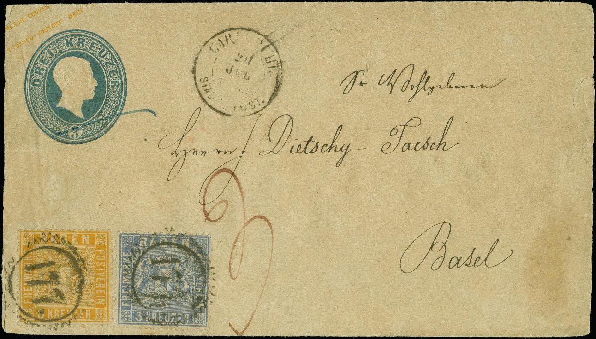 | Zusatzinformationen und Suchstichworte: | Heinrich Köhler 384. Auktion 19./20., 23. - 28. September 2024 Los 6564 Altdeutschland Baden Umschlag 3 Kreuzer preußischblau mit Zufrankatur 1860/61, 3 Kreuzer ultramarin und 6 Kreuzer gelborange, mit Zackenkranz "177" und nebengesetztem DKr. "CARLSRUHE STADTPOST 27 JUL." nach Basel. Der Umschlag übliche Alterspatina und in der Kopfprägung teilweise ausgebrochen und hinterklebt, 3 Kreuzer einige kurze Zähne und die äußere rechte obere Ecke ergänzt, sonst einwandfrei. Eine attraktive und einmalige Kombination. Ausruf 800,00 EUR |