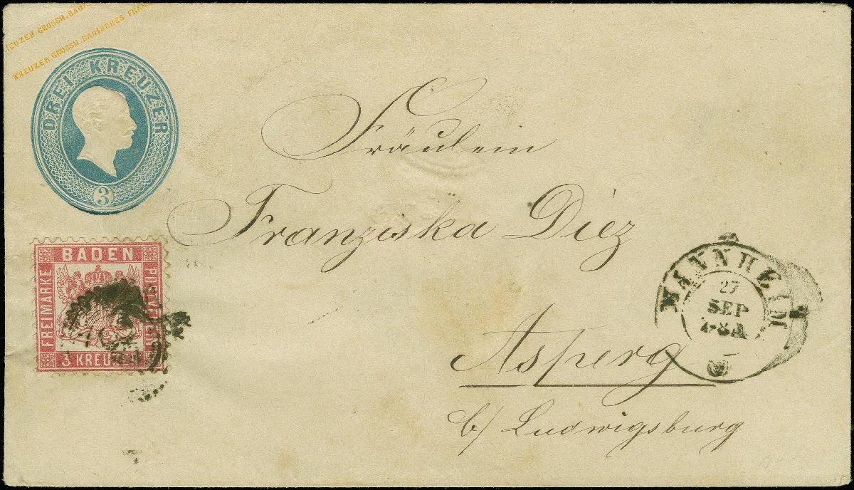 | Zusatzinformationen und Suchstichworte: | Heinrich Köhler 384. Auktion 19./20., 23. - 28. September 2024 Los 6566 Altdeutschland Baden Umschlag 3 Kreuzer blau mit 1862/66, 3 Kreuzer rosarot, farbfrisch und gut gezähnt, mit Zackenkranz "87" und nebengesetztem DKr. "MANNHEIM 27 SEP", nach Asperg bei Ludwigsburg. Der Wertstempel am Kopf etwas ausgebrochen, sonst einwandfreie Erhaltung. Eine sehr seltene Kombination; es sind nur 3 weitere Belege registriert. Ausruf 500,00 EUR |