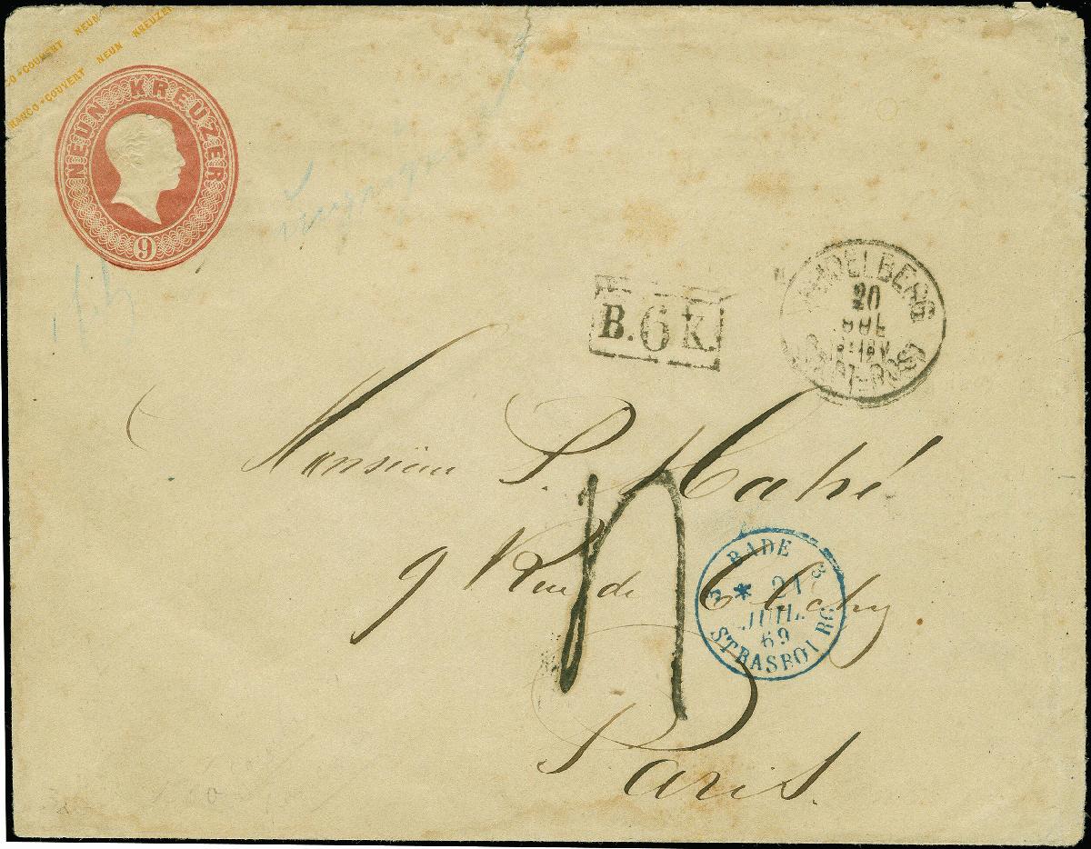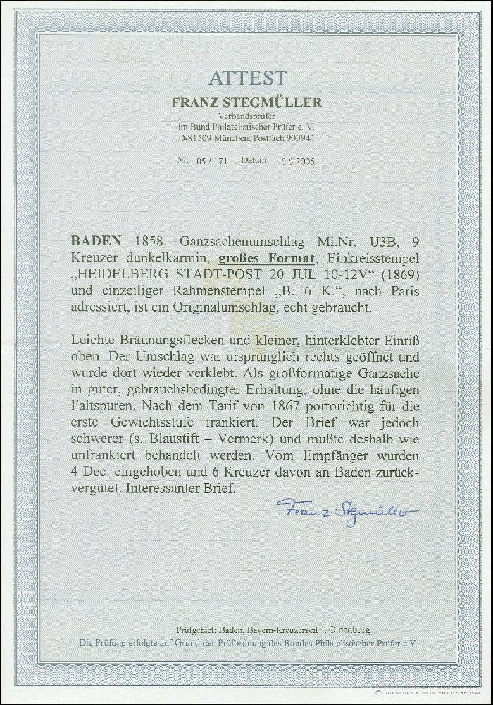 | Zusatzinformationen und Suchstichworte: | Heinrich Köhler 384. Auktion 19./20., 23. - 28. September 2024 Los 6573 Altdeutschland Baden Umschlag 9 Kreuzer karmin im Großformat, mit nebengesetztem EKr. "HEIDELBERG STADT-POST 20 JUL" (1869) nach Paris. Der Brief fiel in die 2. Gewichtsstufe (schwacher Blaustift-Vermerk) und wurde daher nachtaxiert, mit nebengesetztem "B.6K.". Etwas fleckig, oben kleiner Einriss und ursprüngliche Brieföffnung rechts wieder verklebt. Als Auslandsverwendung sehr selten. Ausruf 300,00 EUR |