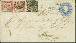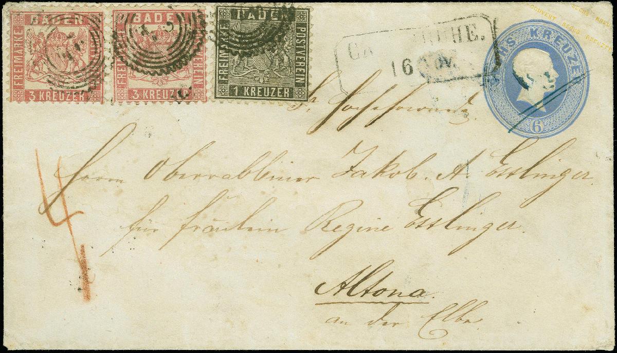 | Zusatzinformationen und Suchstichworte: | Heinrich Köhler 384. Auktion 19./20., 23. - 28. September 2024 Los 6575 Altdeutschland Baden 1862, Wertstempel rechts, Umschlag 6 Kreuzer ultramarin, mit 1862/63, 1 Kreuzer schwarz, in Mischfrankatur mit 2 Einzelwerten 1862/66, 3 Kreuzer rosa, mit Zackenkranz "24" und nebengesetztem Ra. "CARLSRUHE 16 Nov." nach Altona, Dänemark. Die linke obere Ecke der linken 3 Kreuzer ist ergänzt, bei der anderen 3 Kreuzer einige verkürzte Zähne, Teile der Adresse etwas nachgezogen, sonst einwandfrei. Ein attraktiver und mit dieser Frankaturkombination einmaliger Brief nach Dänemark. Ausruf 500,00 EUR |