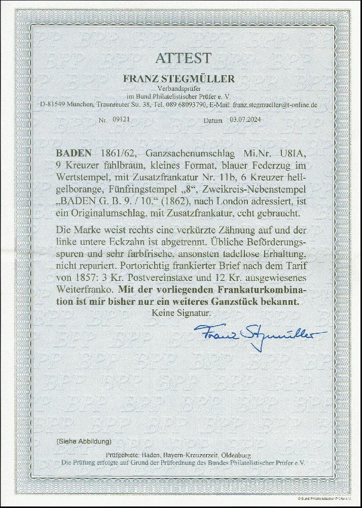 | Zusatzinformationen und Suchstichworte: | Heinrich Köhler 384. Auktion 19./20., 23. - 28. September 2024 Los 6576 Altdeutschland Baden Umschlag 9 Kreuzer braun mit 1862/63, 6 Kreuzer hellgelborange, mit Nr. "8" und nebengesetztem DKr. "BADEN 9/10" (1862), über Frankreich nach London mit vorderseitigen Transit-und Ankunftsstempel. Die Marke kleine Zahnfehler und Umschlag übliche Beförderungspuren, sonst frische und tadellose Erhaltung. Eine außerordentlich seltene Frankaturkombination, es ist nur ein weiterer Beleg registriert. Ausruf 600,00 EUR |