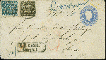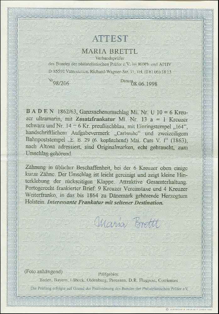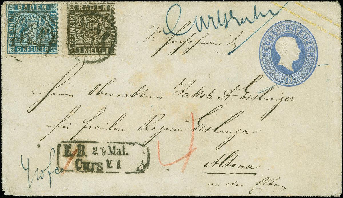 | Zusatzinformationen und Suchstichworte: | Heinrich Köhler 384. Auktion 19./20., 23. - 28. September 2024 Los 6579 Altdeutschland Baden Umschlag 6 Kreuzer ultramarin mit Zufrankatur 1862/63, linierter Hintergrund 1 Kreuzer schwarz und 6 Kreuzer preußischblau, mit Einkreisstempel "164" und nebengesetztem Ra2 "E.B. 29 Mai Curs V.I" (1863) sowie handschriftlichem Aufgabevermerk "Carlsruhe", nach Altona in Holstein, Dänemark, mit ausgewiesen Weiterfranko von "4" Kreuzern. Die 6 Kreuzer einige kurze Zähne, der Umschlag etwas gereinigt und ein kleiner Einriss in der Rückklappe hinterklebt, sonst einwandfrei. Ein attraktiver und in dieser Kombination einmaliger Auslandsbrief. Ausruf 500,00 EUR |