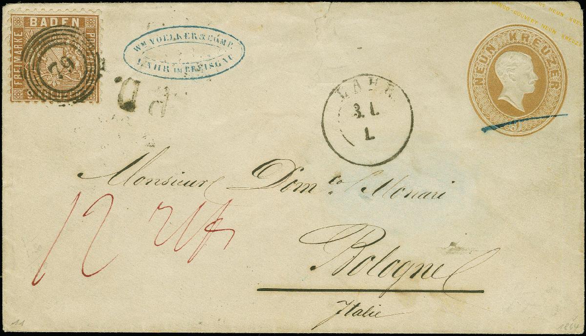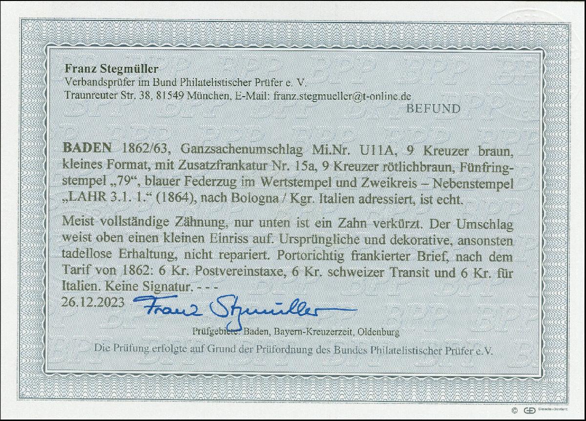 | Zusatzinformationen und Suchstichworte: | Heinrich Köhler 384. Auktion 19./20., 23. - 28. September 2024 Los 6582 Altdeutschland Baden Umschlag 9 Kreuzer braun mit wertstufengleicher Zufrankatur 1862/63, 9 Kreuzer rötlich braun, bis auf einen verkürzten Zahn einwandfrei, mit Nr. "79" und nebengesetztem DKr "LAHR 3.1" (1864), nach Bologna. Rückseitig Öffnungsmängel verklebt, sonst gute Erhaltung. Ausruf 200,00 EUR |