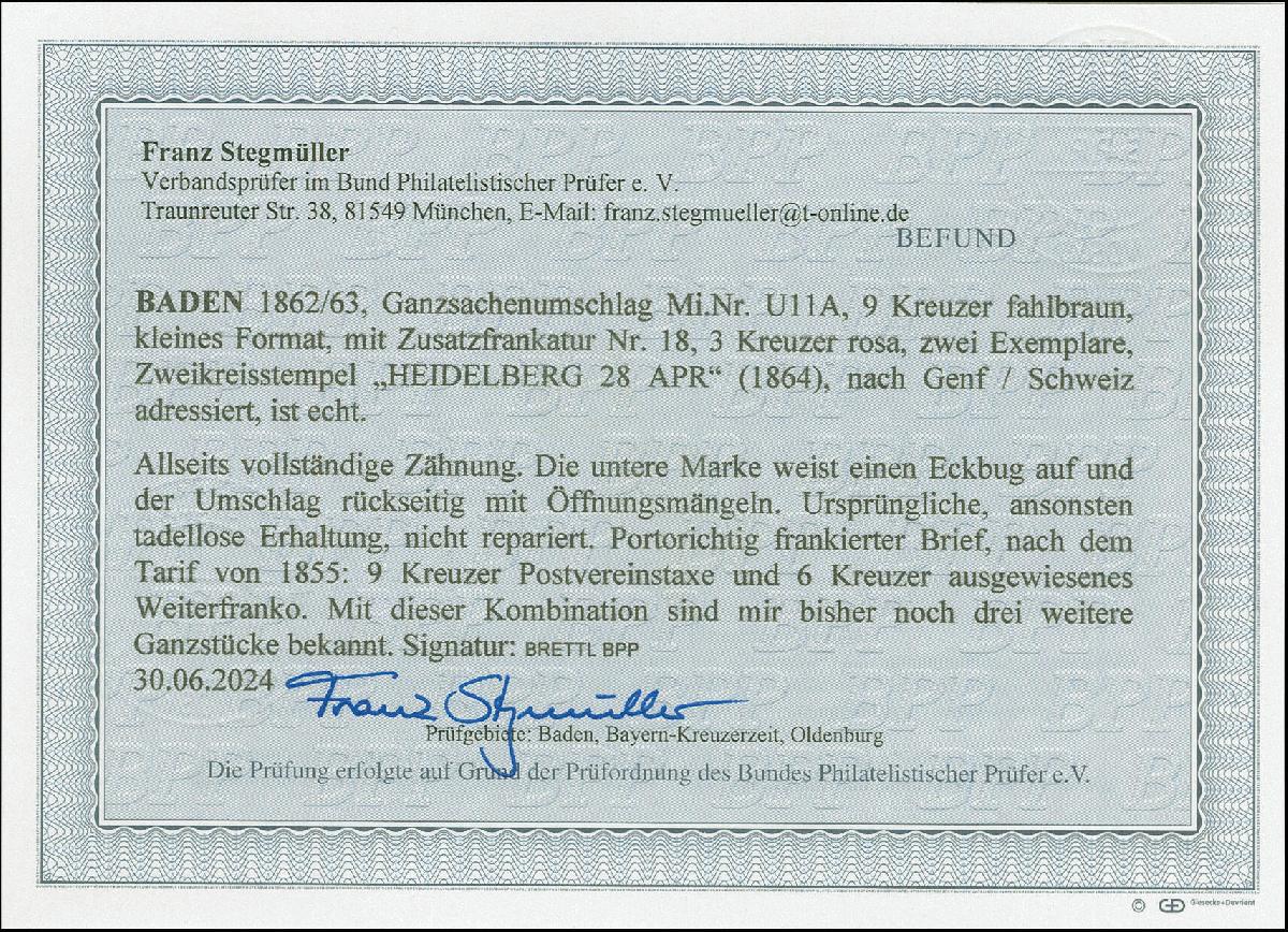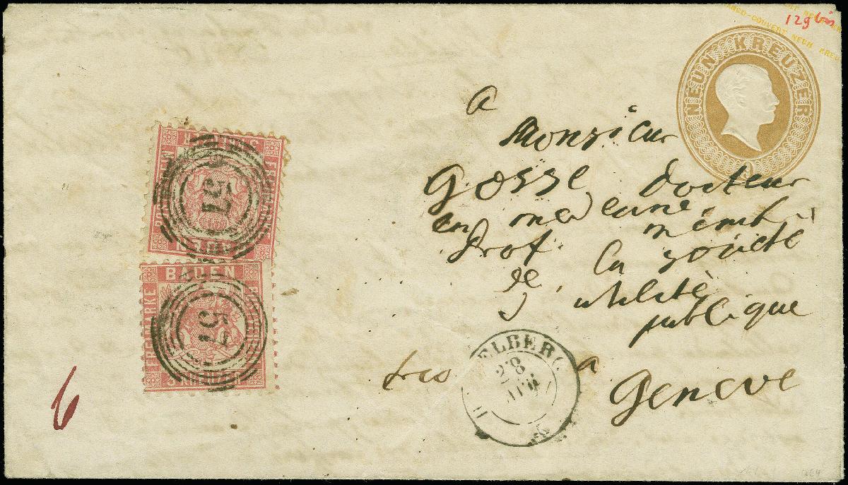 | Zusatzinformationen und Suchstichworte: | Heinrich Köhler 384. Auktion 19./20., 23. - 28. September 2024 Los 6584 Altdeutschland Baden Umschlag 9 Kreuzer fahlbraun mit 2 Einzelwerten 1862/66, 3 Kreuzer rosa (einer kleiner Eckbug), mit Nr. "57" und nebengesetztem DKr. "HEIDELBERG 28 APR"(1864) nach Genf mit ausgewiesenem Weiterfranko. Der Umschlag wurde vom Absender geöffnet und innen wie ein Briefpapier beschrieben. Rückseitig leichte Öffnungsmängel und vorderseitig oben rechts kleine Fremdbeschriftung, sonst gute Erhaltung. Eine sehr seltene Kombination, nur 3 weitere Ganzstücke registriert Ausruf 700,00 EUR |