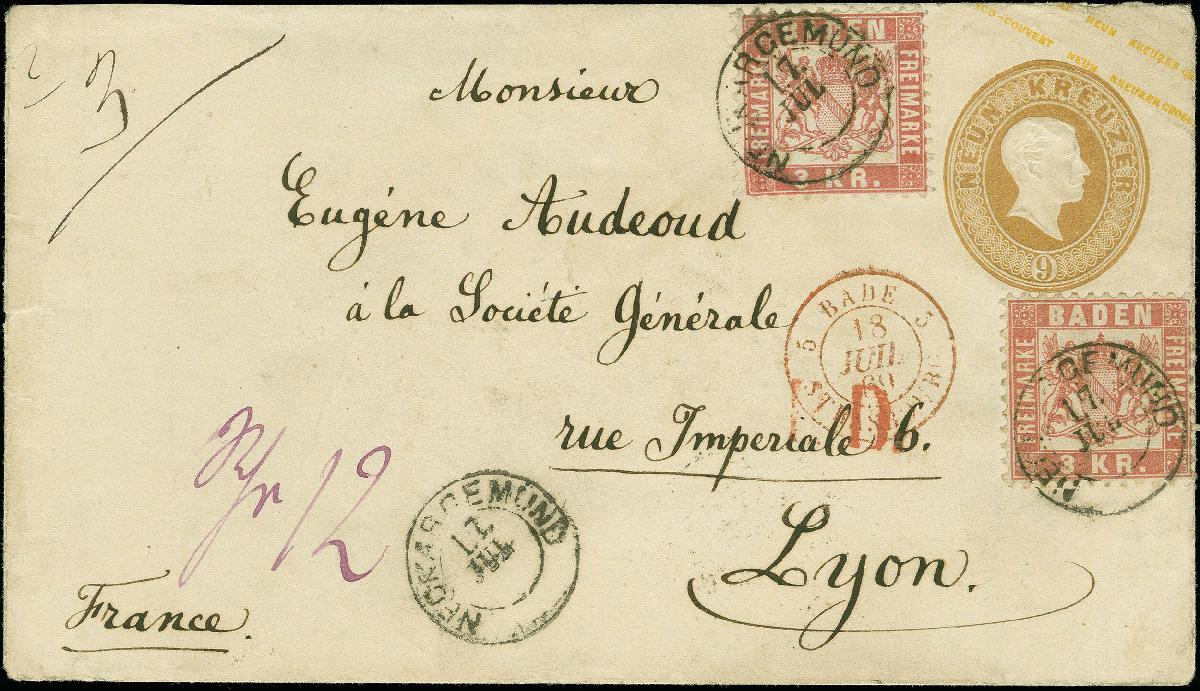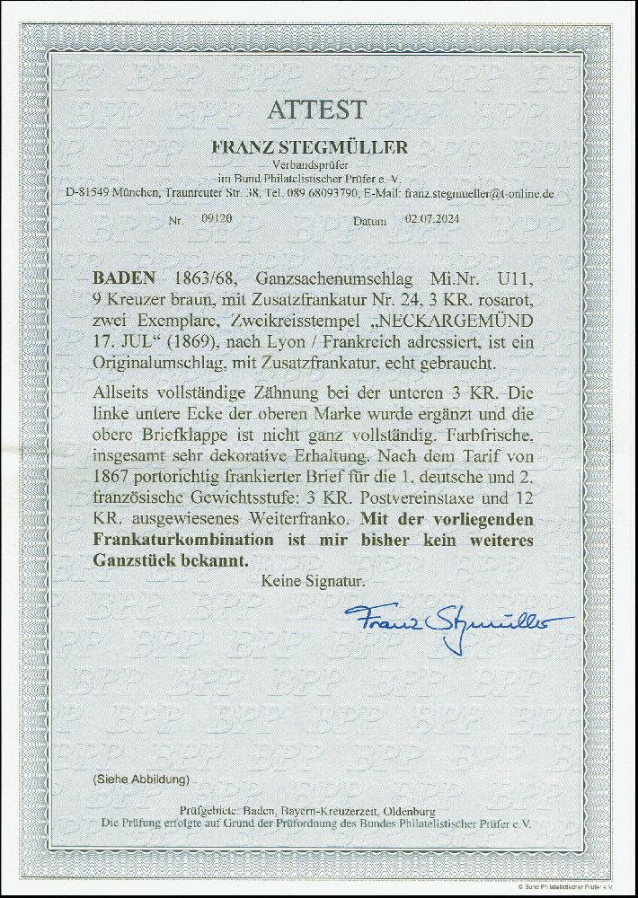 | Zusatzinformationen und Suchstichworte: | Heinrich Köhler 384. Auktion 19./20., 23. - 28. September 2024 Los 6585 Altdeutschland Baden Umschlag 9 Kreuzer braun mit 2 Einzelwerten 1868, 3 Kreuzer rosa, mit DKr. "NECKARGEMÜND 17 JUL." (1869) nach Lyon. Ganz geringe Beförderungsspuren, die rückseitige Verschlussklappe nicht mehr ganz komplett, bei einem Wert die linke untere Ecke ergänzt. Eine sehr attraktive und einmalige Frankaturkombination. Ausruf 700,00 EUR |