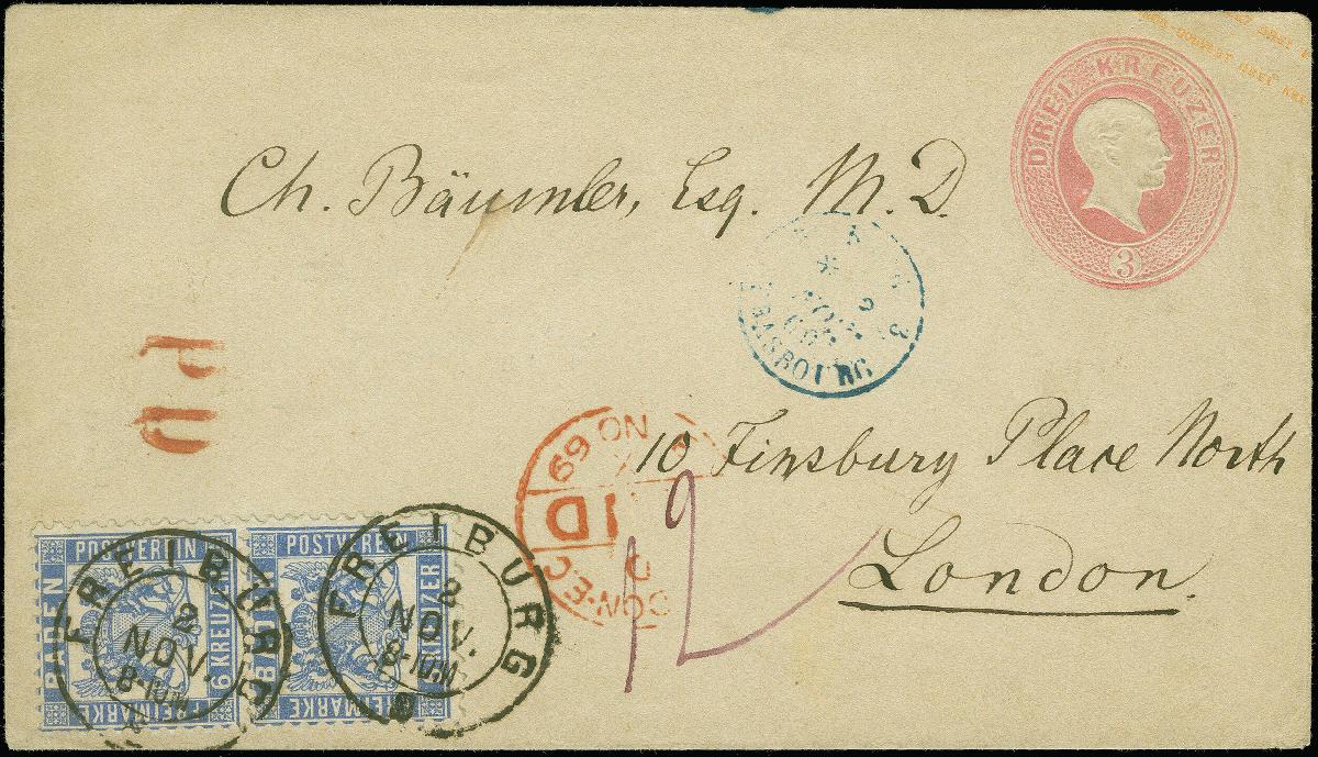 | Zusatzinformationen und Suchstichworte: | Heinrich Köhler 384. Auktion 19./20., 23. - 28. September 2024 Los 6586 Altdeutschland Baden 1866/67, letzte Ausgabe: Umschlag 3 Kreuzer rosa mit 1862/66, 6 Kreuzer ultramarin im senkrechten Paar, farbfrisch und einwandfrei gezähnt, der untere Wert winziger Randspalt, mit klar aufgesetztem DKr. "FREIBURG 8 NOV." (1869), über Frankreich nach London. Sehr schöne und frische Erhaltung. Ausruf 200,00 EUR |