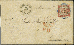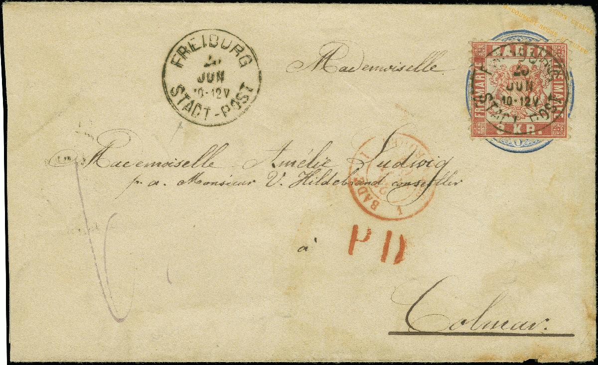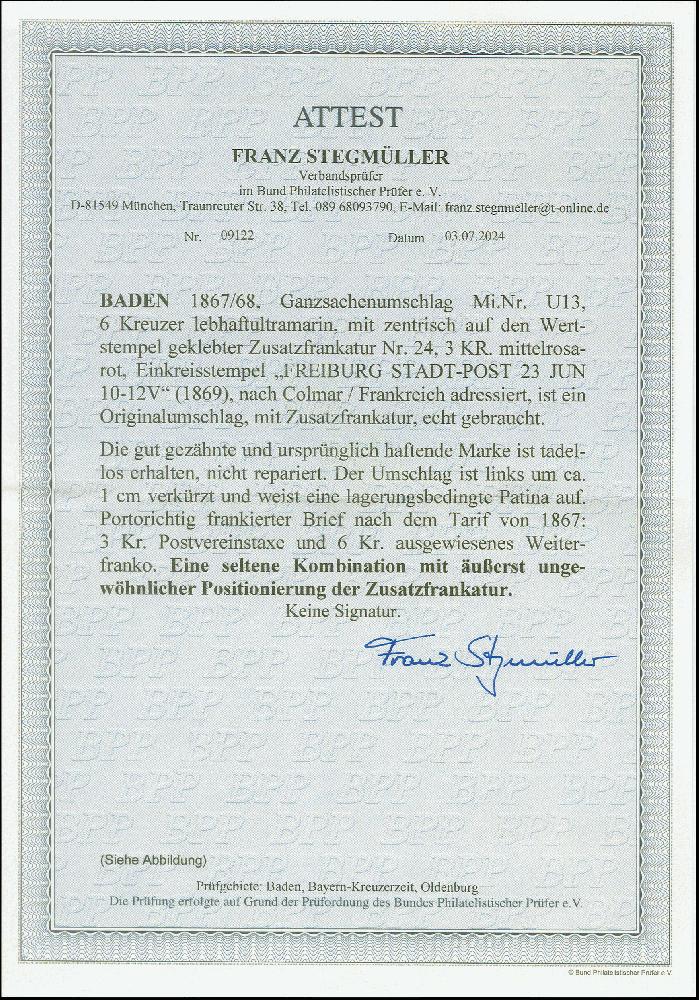 | Zusatzinformationen und Suchstichworte: | Heinrich Köhler 384. Auktion 19./20., 23. - 28. September 2024 Los 6590 Altdeutschland Baden Umschlag 6 Kreuzer lebhaftultramarin, überklebt durch 1868, 3 Kreuzer rosa, farbfrisch und einwandfrei, mit sauber auf- und nebengesetztem EKr. "FREIBURG STADT-POST 23 JUN" (1869) nach Colmar, mit korrekt ausgewiesenem Weiterfranko von 6 Kreuzern. Der Umschlag links etwas verkürzt und leichte Patina, sonst einwandfrei. Von dieser Frankaturkombination sind nur 3 weitere Belege registriert, mit der ungewöhnlichen Positionierung der Zufrankatur ein ganz außergewöhnliches Stück. Ausruf 400,00 EUR |