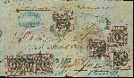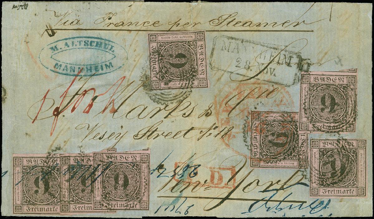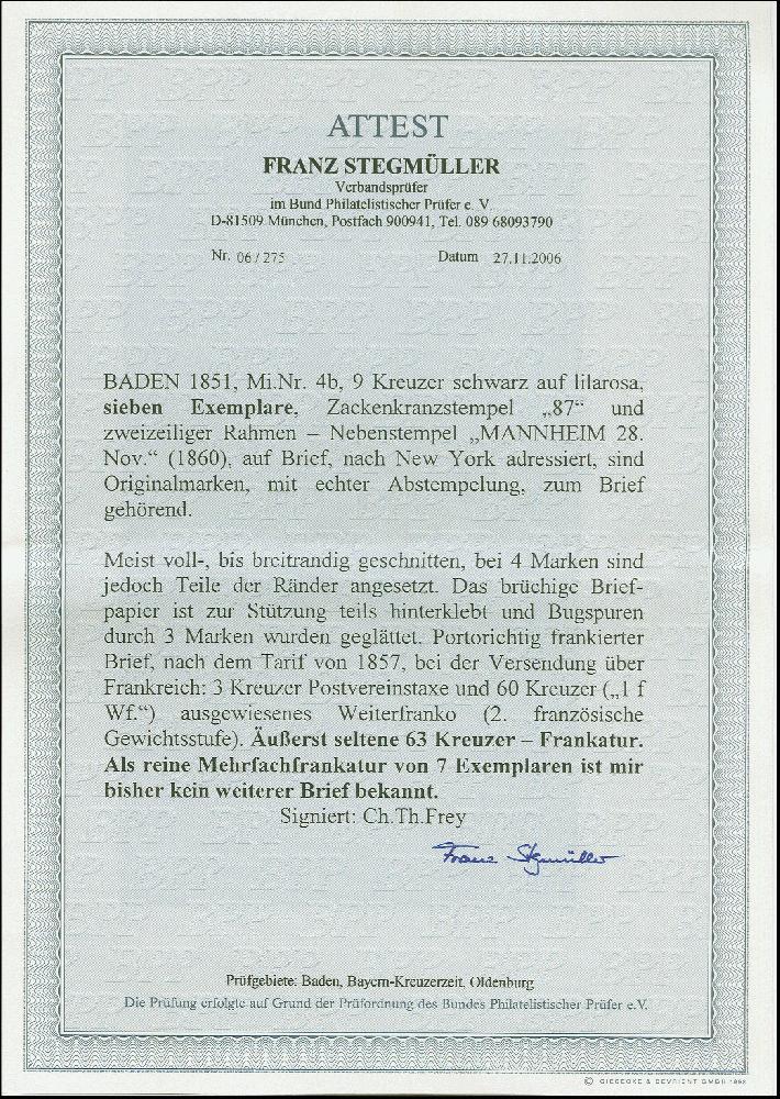 | Zusatzinformationen und Suchstichworte: | Heinrich Köhler 384. Auktion 19./20., 23. - 28. September 2024 Los 6592 Altdeutschland Baden 9 Kreuzer auf lilarrosa, 7 Einzelwerte, teils treppenförmig geklebt, mit Zackenkranz "87" und nebengesetztem Ra2 "MANNHEIM 28. Nov." auf Briefhülle der 2.französischen Gewichtsstufe, über Frankreich nach New York, nach dem Tarif von 1857 portogerecht frankiert mit 1 Franc (= 60 Kreuzer) ausgewiesenem Weiterfranko. Der Brief ist geglättet, bei 4 Marken Teile der Ränder ergänzt und das brüchige Briefpapier zur Stützung teils hinterklebt. Ein insgesamt attraktiver und außerordentlich seltener Brief; größte registrierte Mehrfachfrankatur dieser Marke, von der wir keine weitere registriert haben. Ausruf 1.800,00 EUR |
