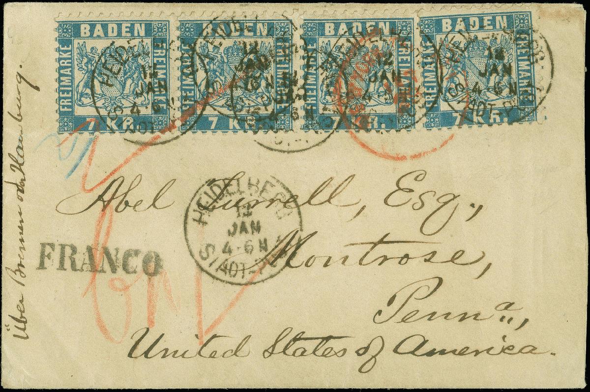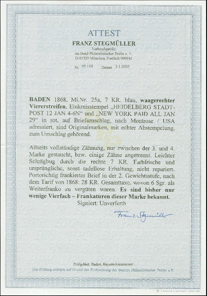 | Zusatzinformationen und Suchstichworte: | Heinrich Köhler 384. Auktion 19./20., 23. - 28. September 2024 Los 6601 Altdeutschland Baden 7 Kreuzer blau im waagerechten Viererstreifen, farbfrisch und gut gezähnt, mit EKr. "HEIDELBERG STADT-POST 12 JAN" auf kleinem Briefkuvert der 2.Gewichtsstufe über Bremen in die USA, mit auf die Frankatur übergehendem "NEW YORK PAID ALL". Die Zähnung zwischen der 3.und 4. Marke gestaucht bzw. einige Zähne angetrennt, durch den rechten Wert unauffällige leichte Bugspur. Größte bekannte Einheit dieser Marke auf Brief; eine in dieser Form einmalige Transatlantik-Frankatur. Ausruf 1.800,00 EUR |