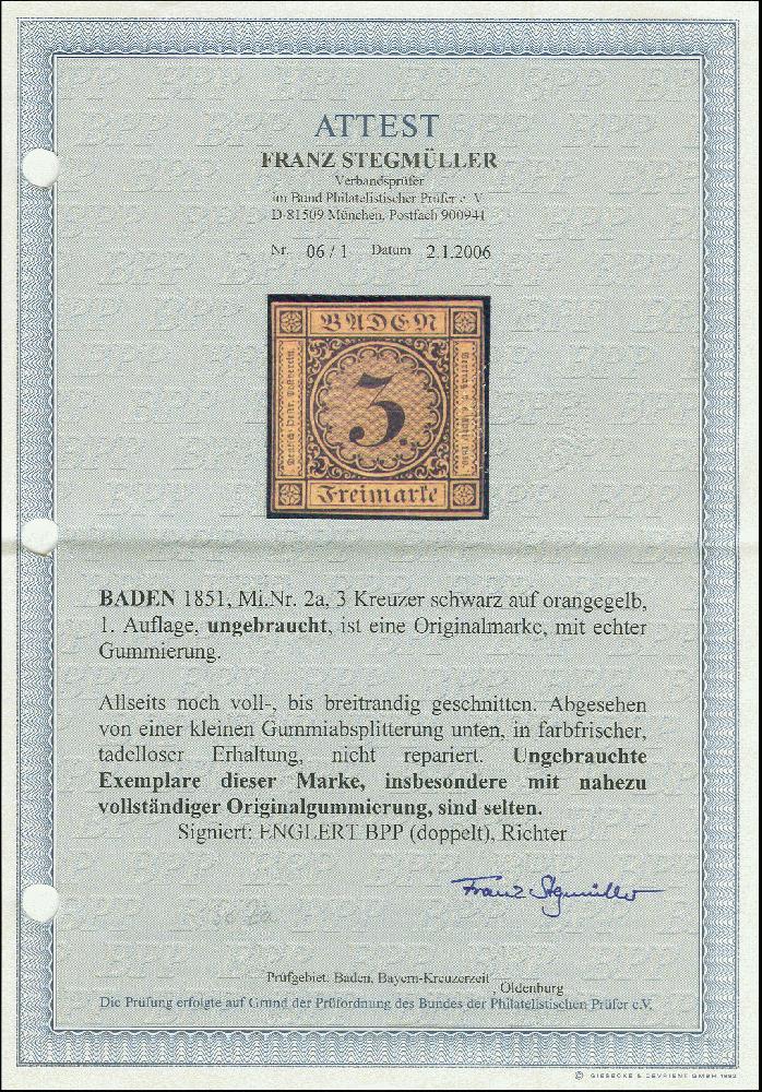 | Zusatzinformationen und Suchstichworte: | Heinrich Köhler 384. Auktion 19./20., 23. - 28. September 2024 Los 8002 Altdeutschland Baden 3 Kreuzer auf orangegelb, farbfrisch und allseits voll- bis breitrandig, ungebraucht mit nahezu vollständigem Originalgummi. Schöne und einwandfreie Erhaltung. In dieser Erhaltung sehr selten Ausruf 500,00 EUR |