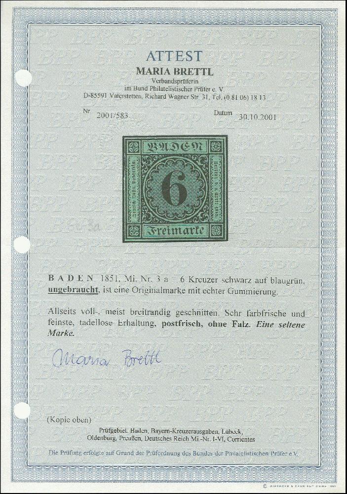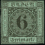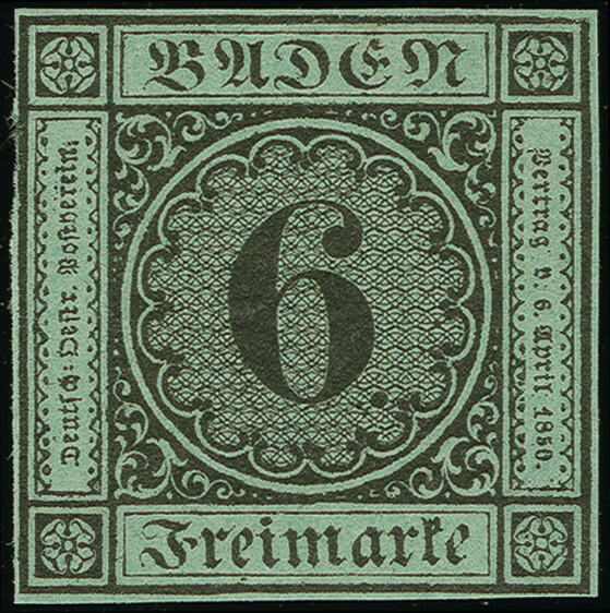 | Zusatzinformationen und Suchstichworte: | Heinrich Köhler 384. Auktion 19./20., 23. - 28. September 2024 Los 8003 Altdeutschland Baden 6 Kreuzer auf blaugrün, sehr schöne Tiefe ursprüngliche Farbe, links oben ganz kurz minimal berührt, sonst voll- bis meist breitrandig, mit vollem Originalgummi, postfrisch. In diese schönen Erhaltung außerordentlich selten. Ausruf 2.000,00 EUR |