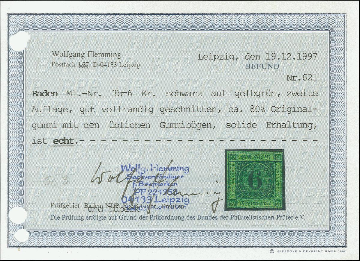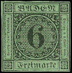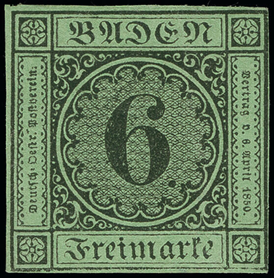 | Zusatzinformationen und Suchstichworte: | Heinrich Köhler 384. Auktion 19./20., 23. - 28. September 2024 Los 8007 Altdeutschland Baden 6 Kreuzer auf gelbgrün, sehr schöne Tiefe frische Farbe und noch voll-bis breitrandig (rechts mit der Randlinie geschnitten), ungebraucht mit Originalgummi. Schöne und einwandfreie Erhaltung (übliche geringe Gummi Büge). Eine in ungebrauchter Erhaltung außerordentlich seltene Marke. Ausruf 400,00 EUR |