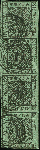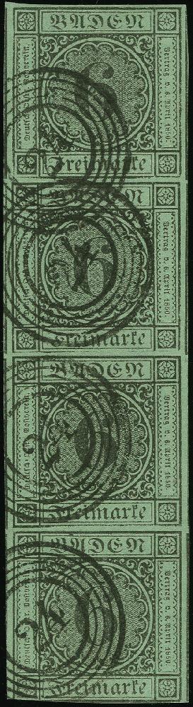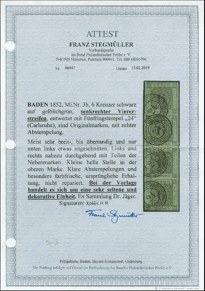 | Zusatzinformationen und Suchstichworte: | Heinrich Köhler 384. Auktion 19./20., 23. - 28. September 2024 Los 8013 Altdeutschland Baden 6 Kreuzer auf gelbgrün im senkrechten Viererstreifen, und links gering angeschnitten, sonst allseits voll- bis meist überrandig, mit Teilen von 8 Nachbarmarken, sauber entwertet durch Nr. "24" CARLSRUHE. Die obere Marke kleine Schürfung rückseitig, sonst tadellos. Eine attraktive und sehr seltene Einheit, es sind nur 4 weitere Viererstreifen dieser Marke registriert, davon einer auf Brief. Ausruf 1.500,00 EUR |