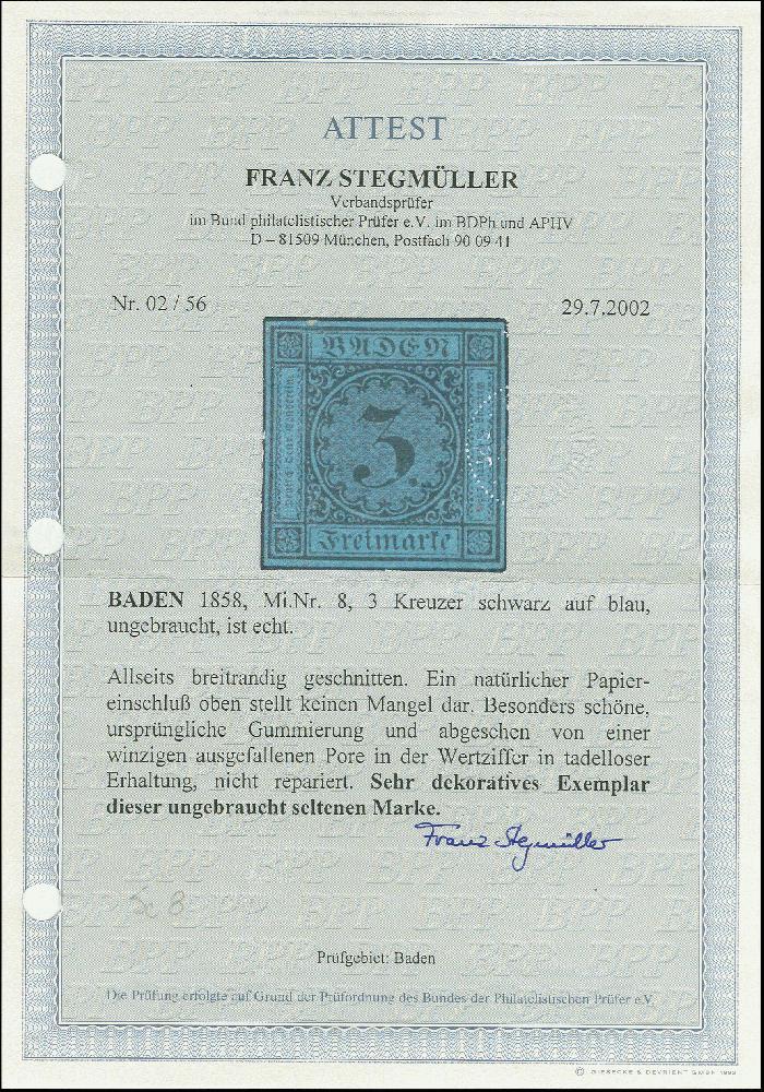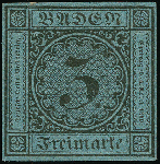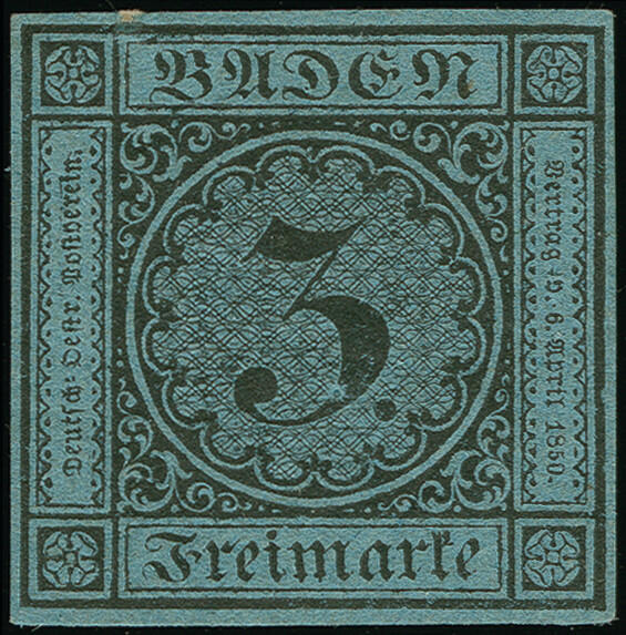 | Zusatzinformationen und Suchstichworte: | Heinrich Köhler 384. Auktion 19./20., 23. - 28. September 2024 Los 8016 Altdeutschland Baden 3 Kreuzer auf blau, sehr schön farbfrisch und voll- bis breitrandig, ungebraucht. Im Bereich der Ziffer kleine Papierpore durch ausgefallenen Fremdkörper, sonst tadellos (oben links kleiner natürlicher Holzeinschluss). In dieser Erhaltung und mit Originalgummi eine sehr seltene Marke. Ausruf 500,00 EUR |