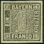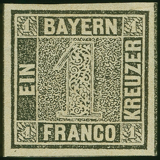 | Zusatzinformationen und Suchstichworte: | Heinrich Köhler 384. Auktion 19./20., 23. - 28. September 2024 Los 3976 Altdeutschland Bayern 1 Kr. schwarz, Platte 1, farbfrisch und allseits breitrandig, dreiseitig mit Zwischenlinien, ungebraucht mit frischem Originalgummi. Tadellos. Ausruf 400,00 EUR |